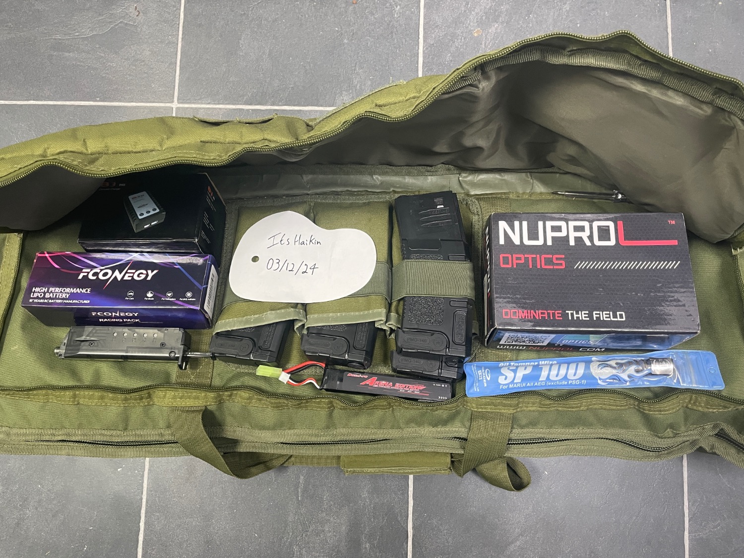 - 4 Mags - Red dot sight - 2x Lipo batteries - Charger - Carry bag - speed loader - Gun Sling