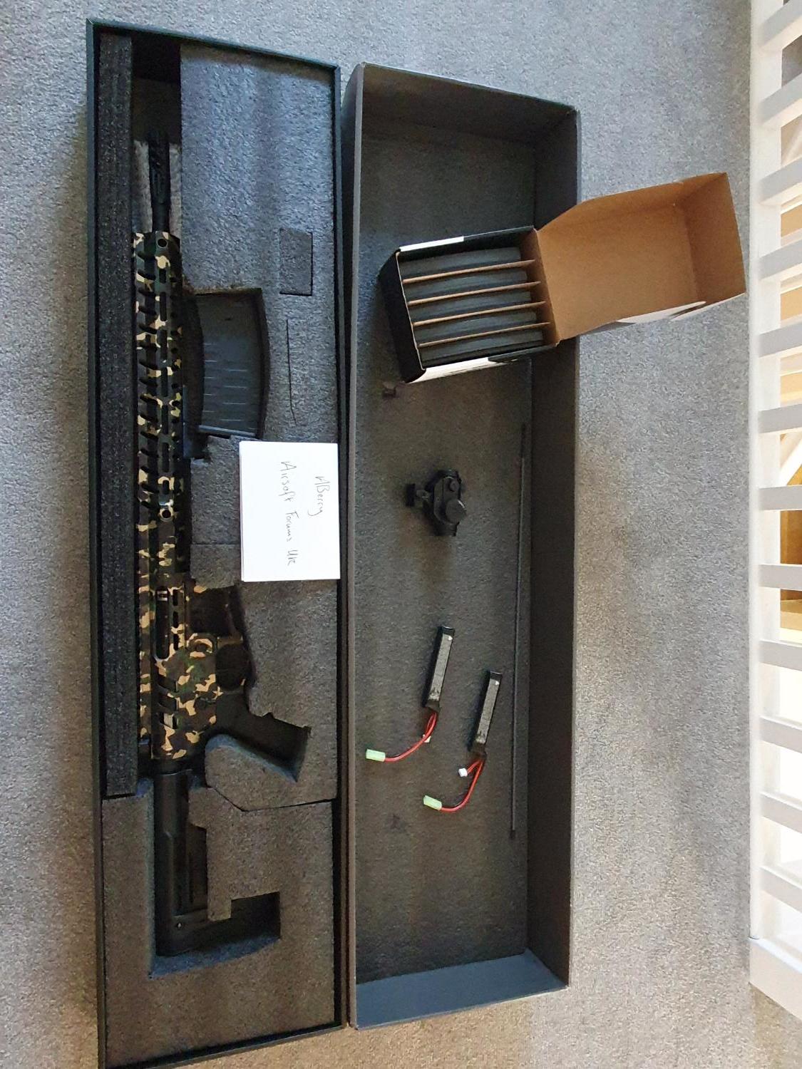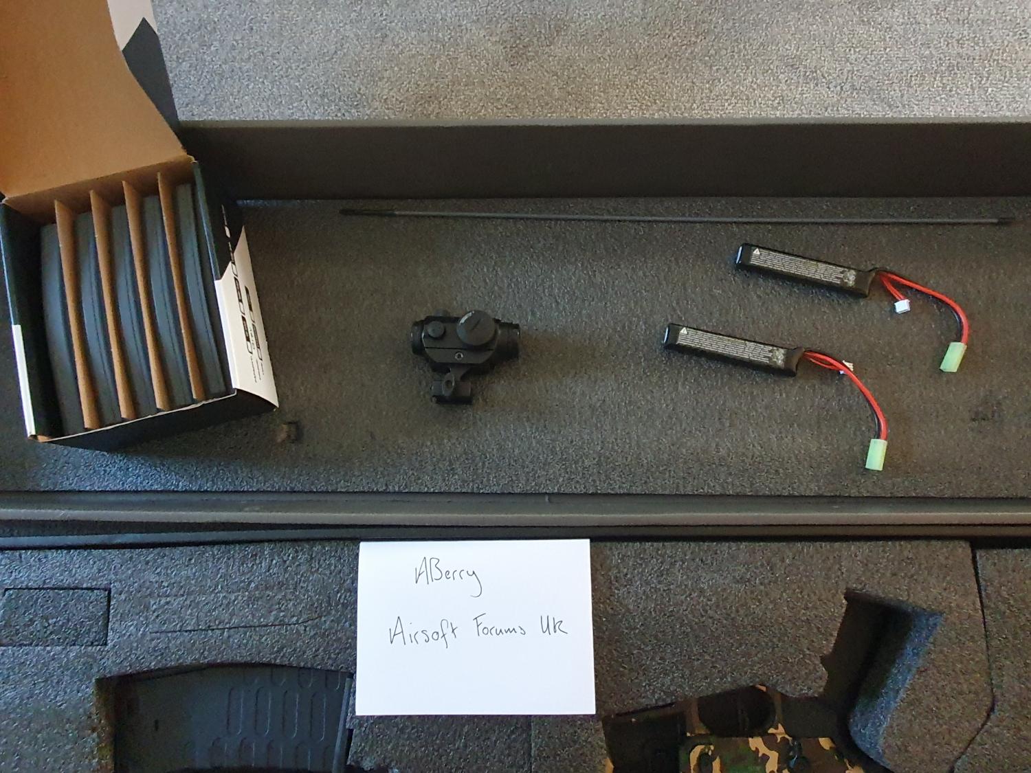 Bought this earlier on in the year from Zero One Airsoft to replace a gas-operated MP7 that I found tiresome to use. Since I bought it, it has been to about 5 games before I was no longer able to afford going as frequently. Since then (June), it has been kept in its box and is in a good condition. I am selling it with all of the attachments I bought for it for free, including the optics (Zero One RD1-L Red Dot), 2x Zero One 7.4V LiPo Batteries, x5 Mid-Cap Magazines (Specna Arms) and handle. If you do not want the attachments, let me know.