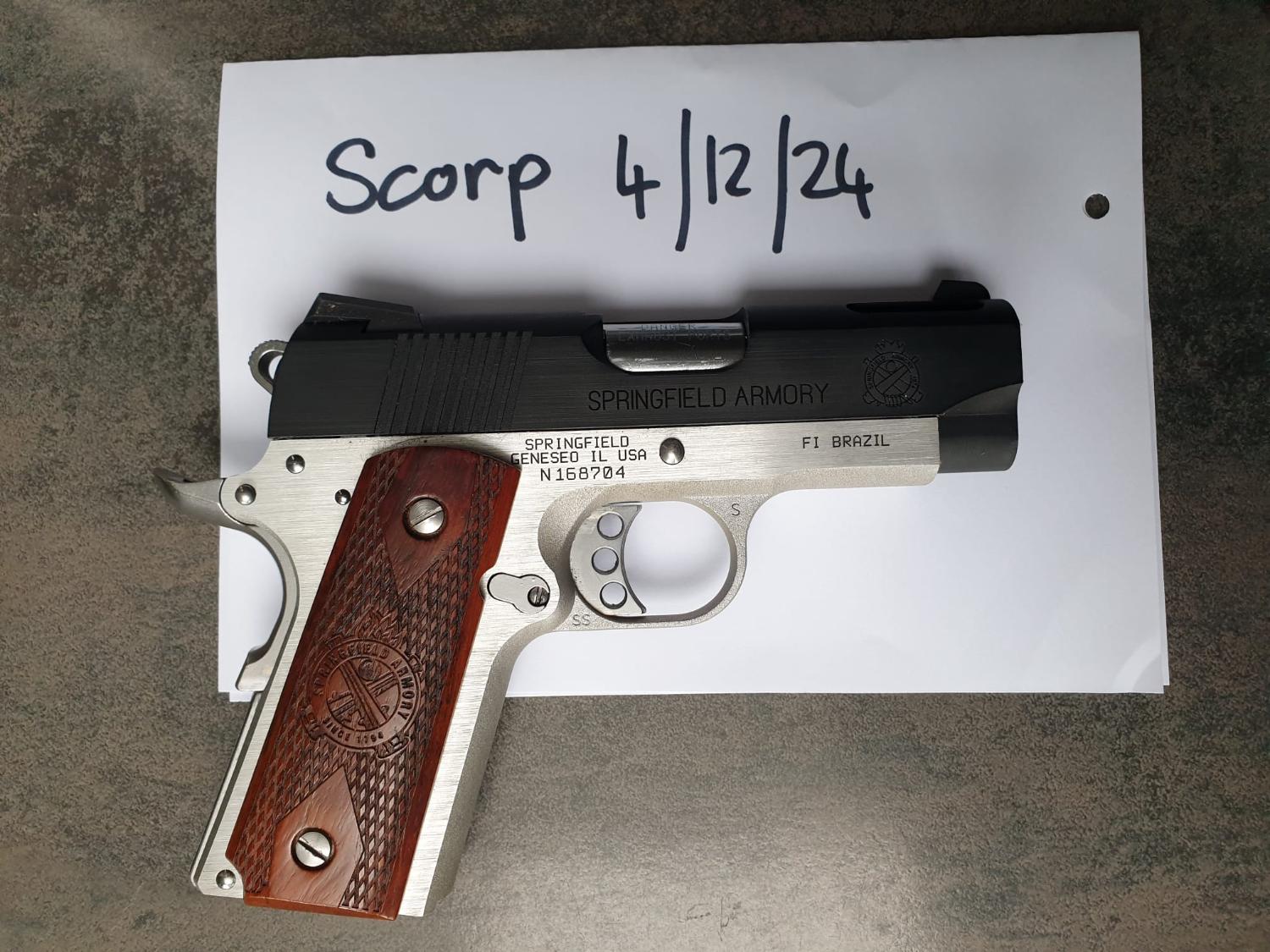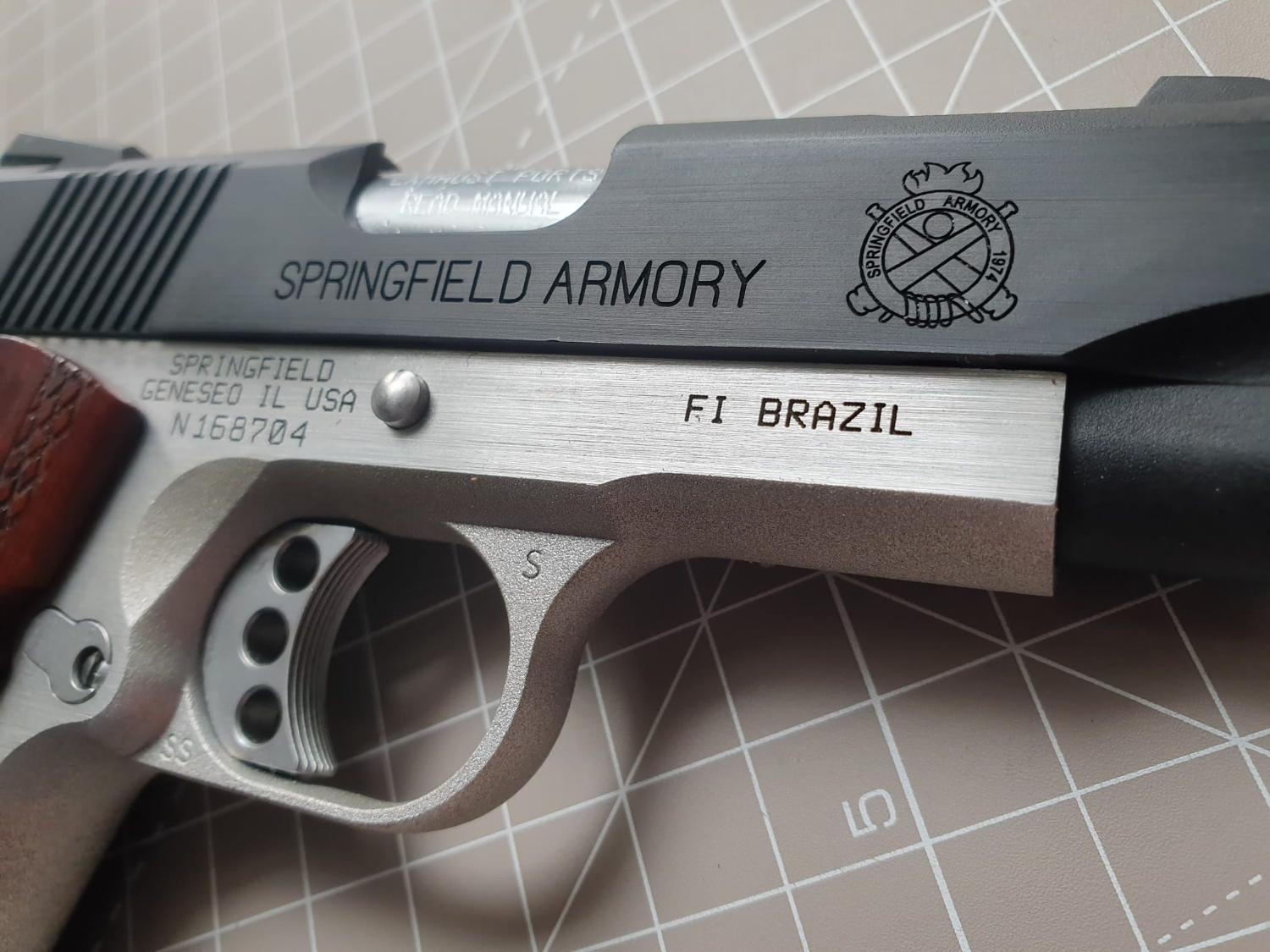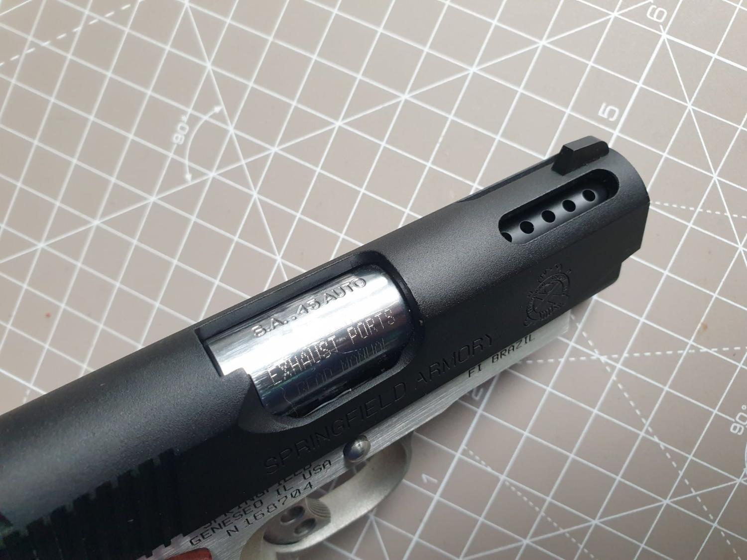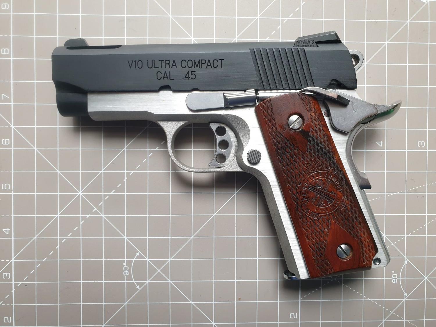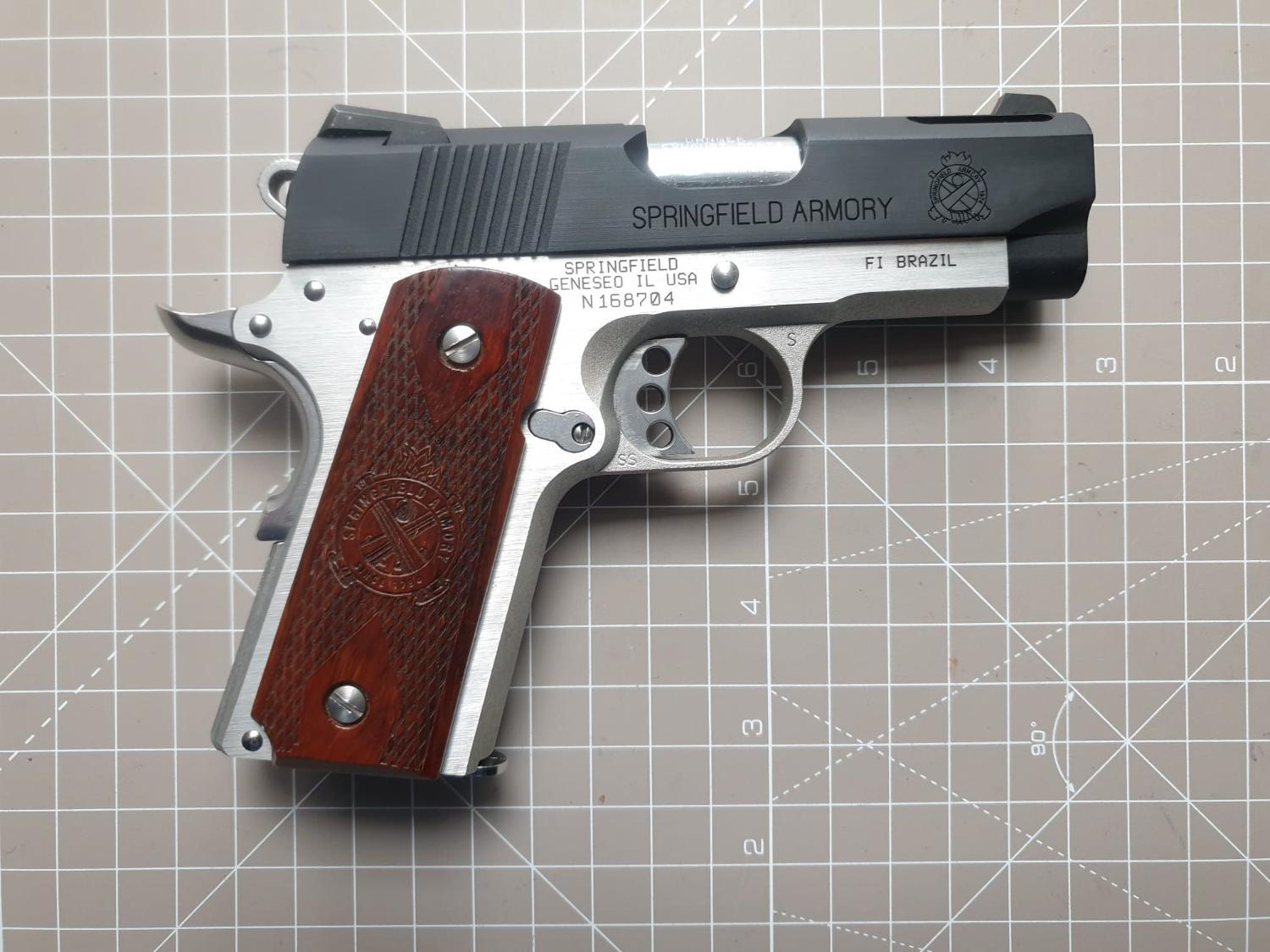 Here is a lovely looking 'Springfield Armoury' Replica using the Tokyo Marui V10 1911 Ultra Compact, which has the frame and slide swapped out with a two tone Guarder Aluminium kit, and Kimpoi 'Springfield' real wood hand carved grips.