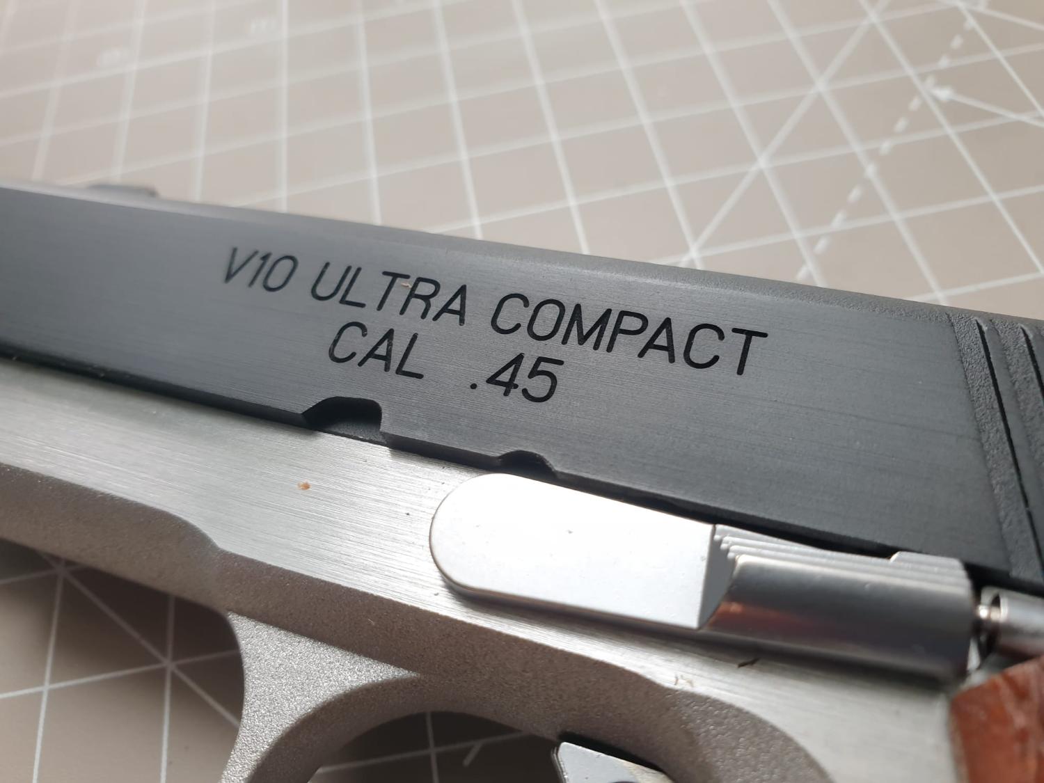 Tokyo Marui V10 Ultra Compact in two tone Guarder Frame and Slide with Wood Grips