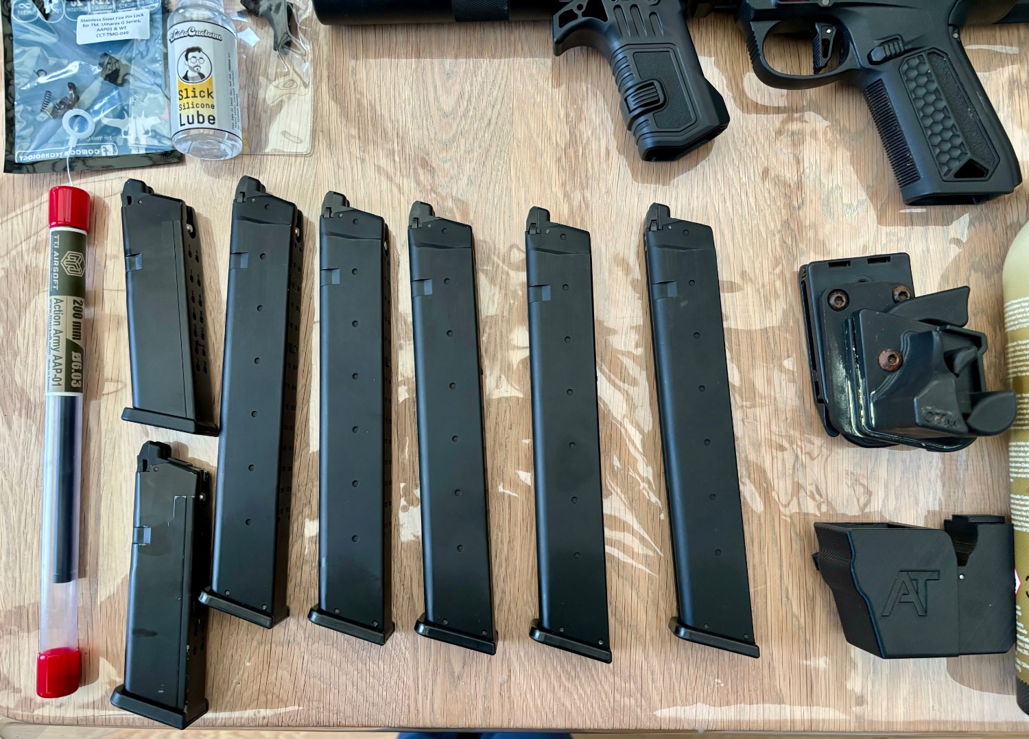 Comes with a pile of magazines (5 extended Raven Nuprol and 2 Action Army standard) all brand new.