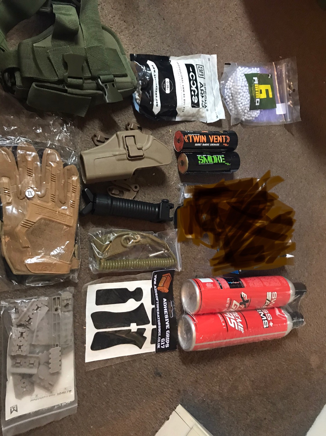 Glock holsters, gas, bbs, gloves, smoke check photos for rest ask for prices on individual items