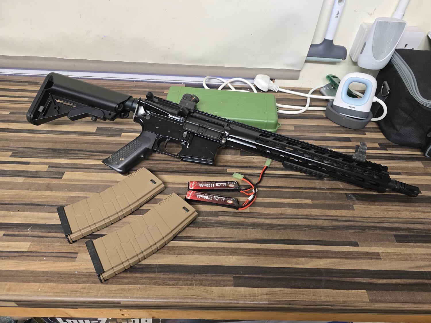 Hi this is a m4 i have made up from prats i had laying around, it shoots and works as it should. Could be good for someone starting out or for a garden. Comes with m4, 2 magazine and batterty