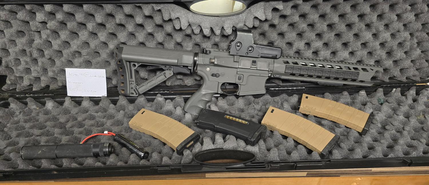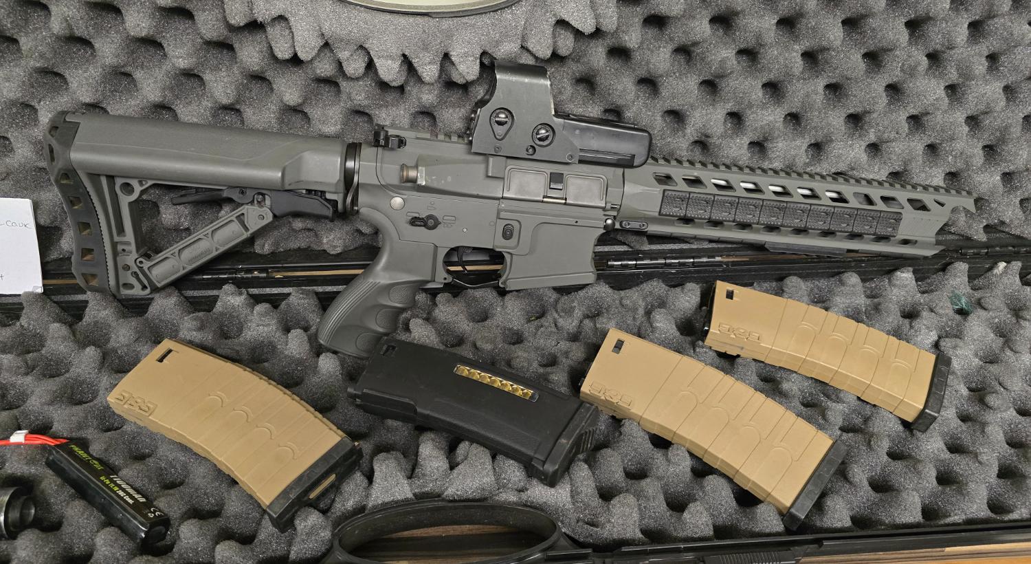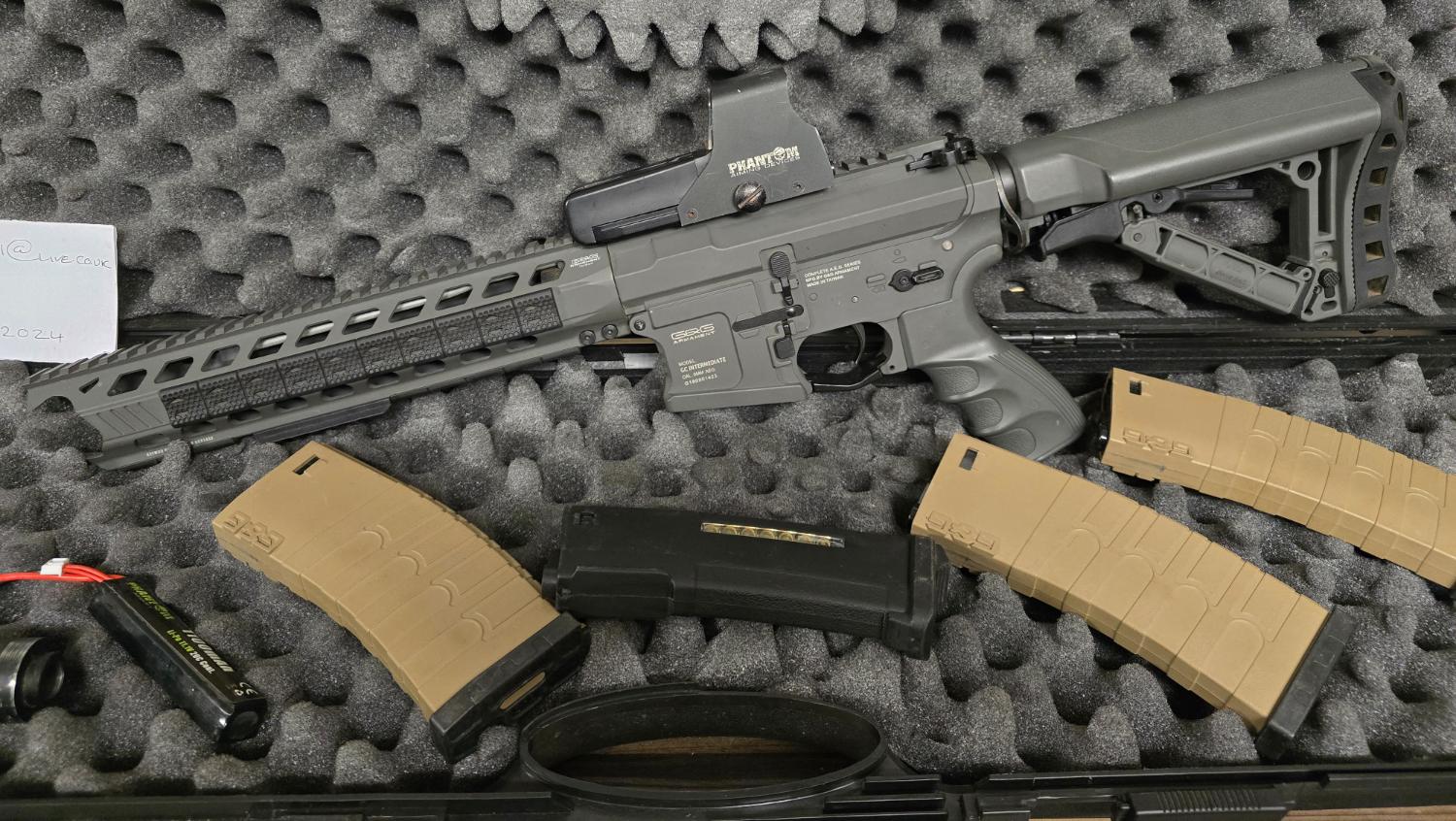 G&G Armament GC16 Intermediate Series Predator, Battleship Grey. Great gun and feels really well built and light weight, this is Reprogrammable, KeyMod Handguard and Ambidextrous Design. Comes with 4 magazines, sight, battery and suppressor. I have attached a link to them below.