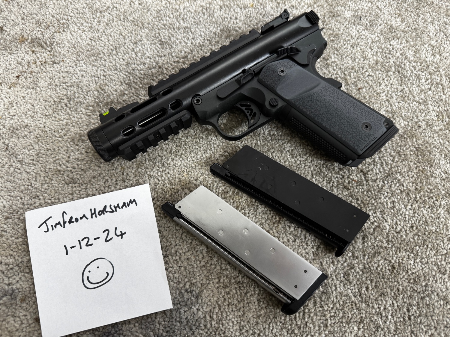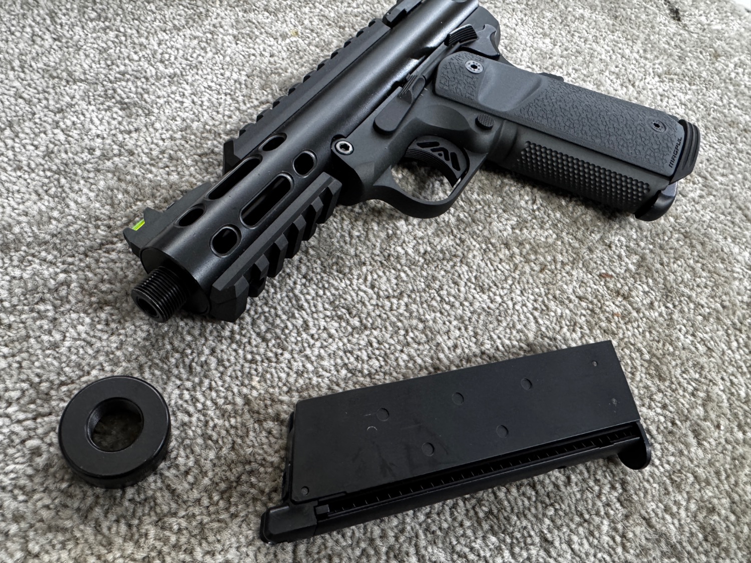 WE Galaxy 1911 variant , good fun gun and runs on WE 1911 magazines , rails , threaded muzzle , fitted with genuine Magpul 1911 grips and comes with a spare magazine . No original box but will be sent securely .