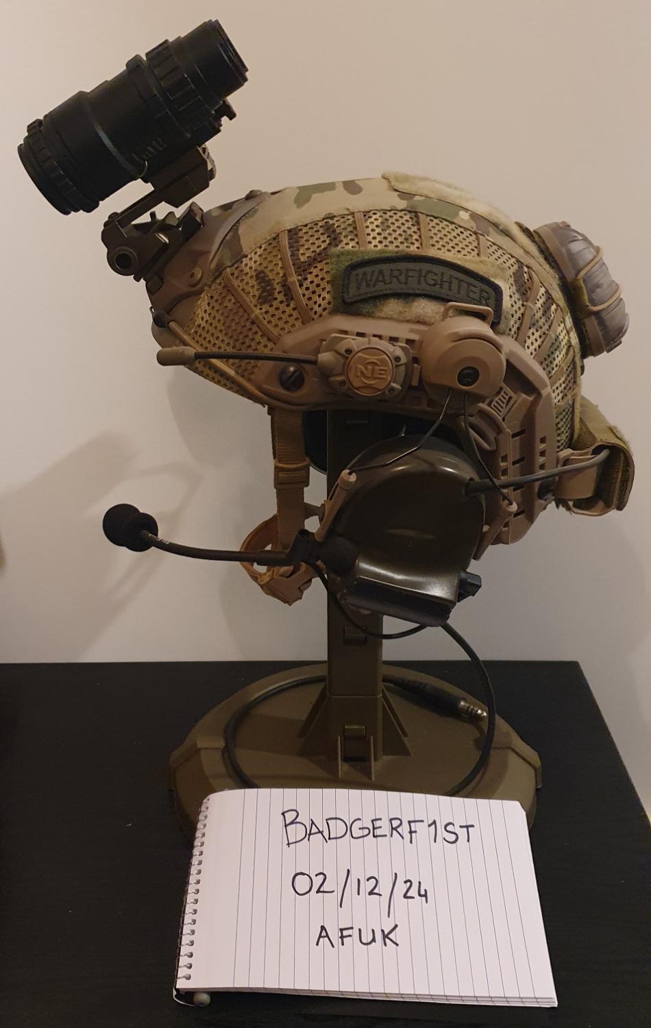 Size M-L FMA Fast helmet carbon fibre version (good weight and heft, definitely not cheap and flimsy) with Dark Earth shell, fitted with the upgraded padding kit,