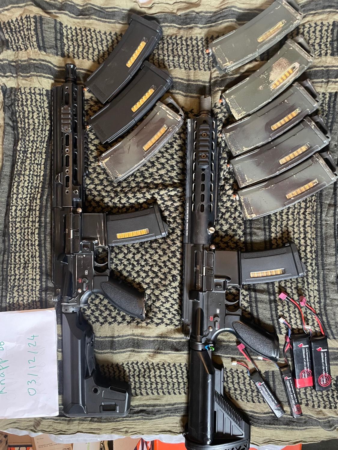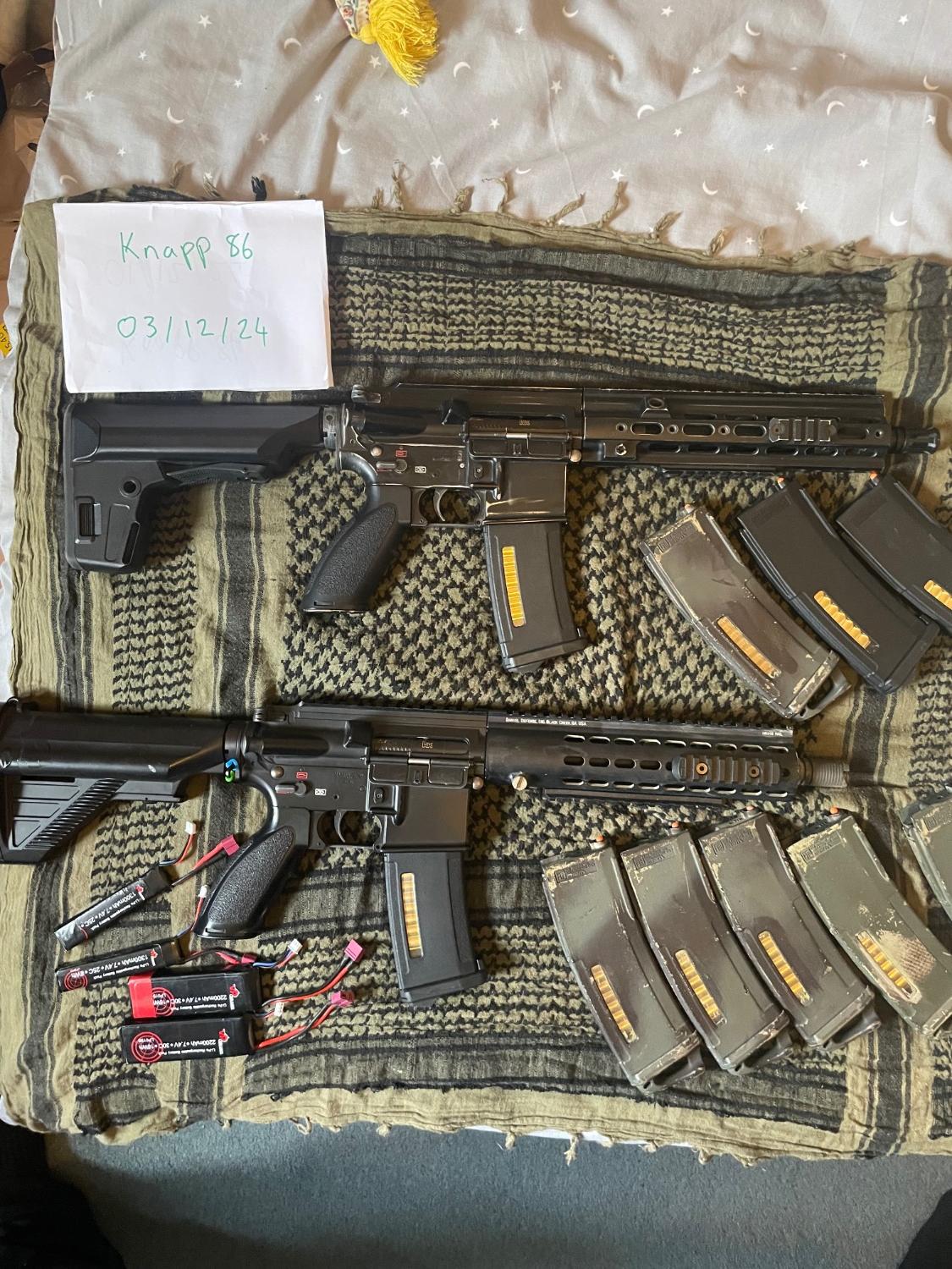 Hi all I’m selling my NGRS’s they both fire but need parts to get them fully functioning. They both have tight bore barrels and maple leaf hops. Wired to deans. The one on the top has had a servise recently with a new specna arms motor and is about 350fps and I was told to use at least a .32 bb. The other needs looking at. It works just a bit low powered at the mo. They both fire just need parts from TM. Myself and my tech couldn’t be bothered to get hold of them lol.. The top one needs the parts to fix the fake bolt. It doesn’t move when fired and the bolt releases catch doesn’t work so it works like a standard AEG. The other one the bolt releases catch works but the bolt doesn’t move either. So hit the bolt release on reloading.