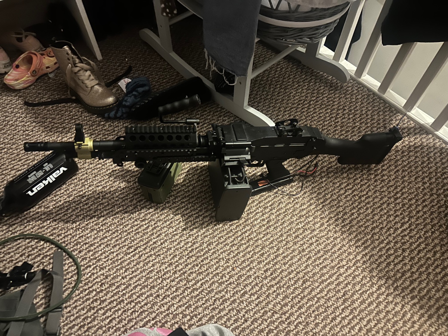 m249 full metal apart from stock, cnc hop unit, maple leaf rubber and new inner barrel. Do have 2 mags but I think one isn’t working, I don’t have the correct charger to try it. £300 open to offers and trade/px for something gas or ngrs.
