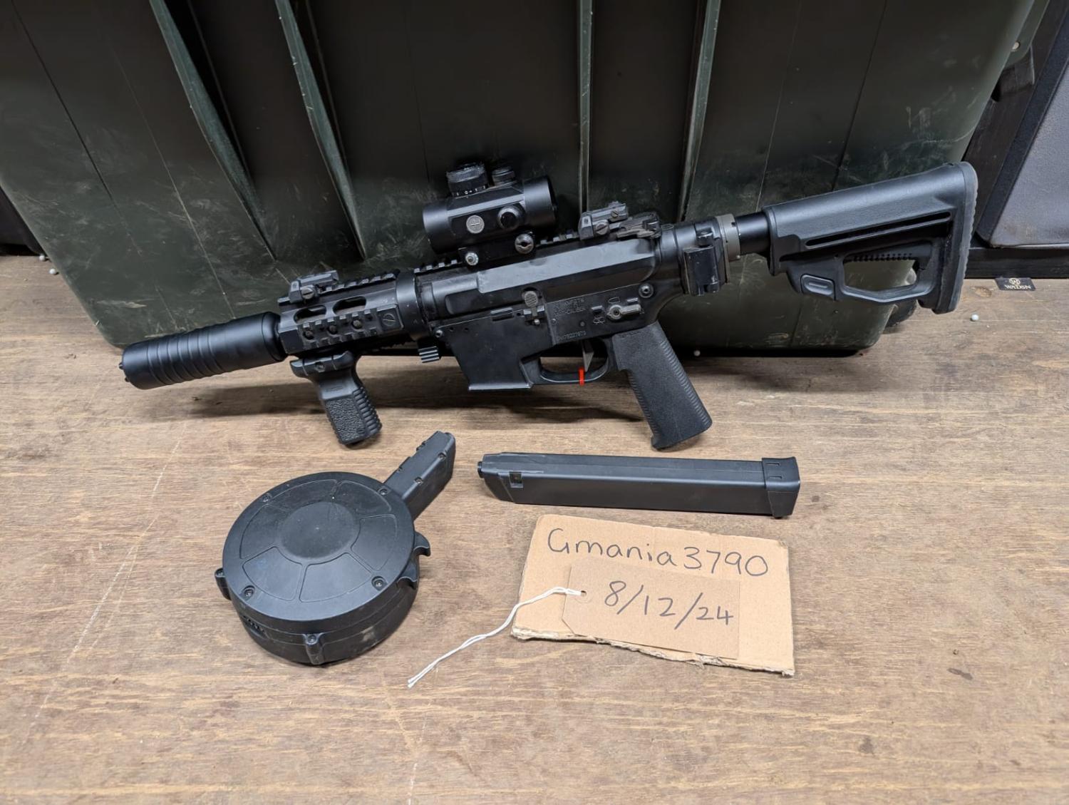 Upgraded with 6.03 barrel, maple leaf rubber, Suppressor, Red dot, Foregrip, 1 Standard Mag. 1 Drum Mag.
