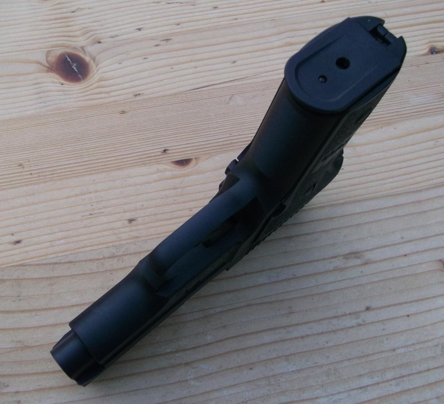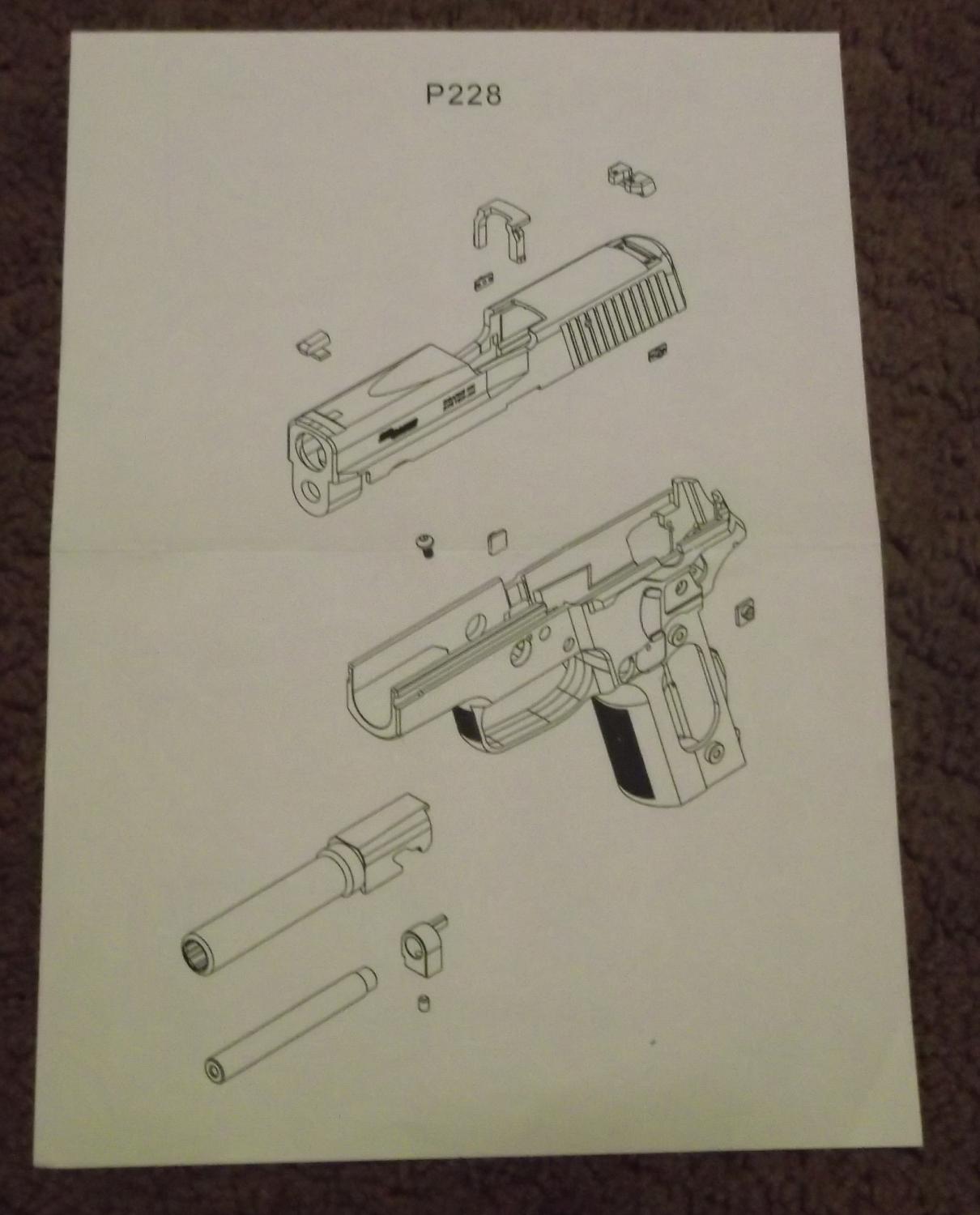 Sig Sauer P228. Built from a Prime airsoft kit, Marui P226 and Guarder parts. Genuine Sig P228 grips and two magazines. Built as a collector model but fully working. Has strong springs fitted so only fires around 10 BBs per gas charge. Springs could be replaced for standard parts to improve performance. Heavy accurate copy of the Sig P228.