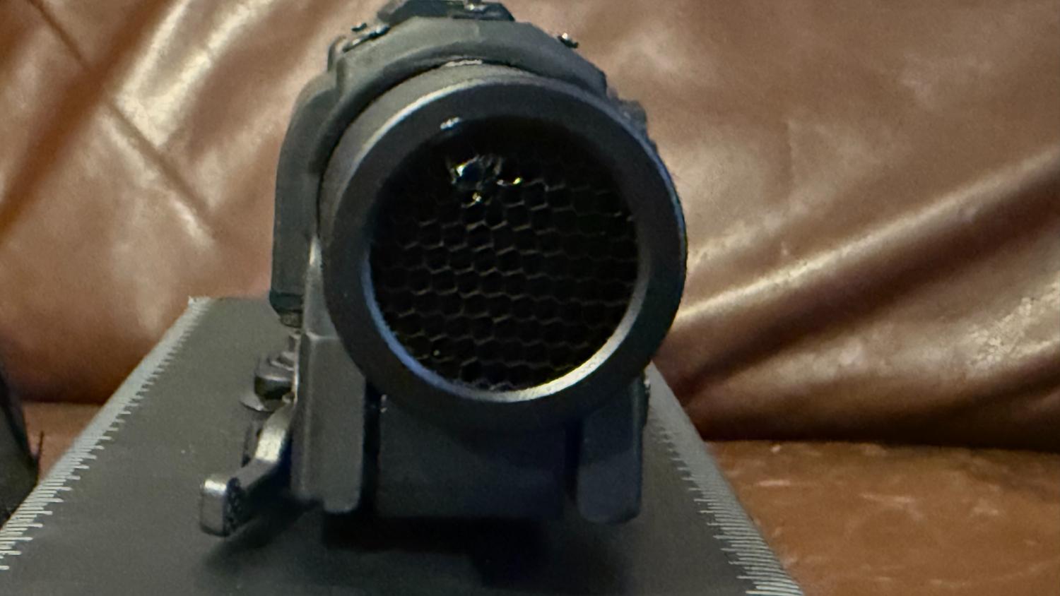 Optically clear has a flash hider on the front which has taken a couple of BBs as shown in the photos. No other damage can be set to red or blue comes with soft case 1 to 4 magnification with the switch on the side, quick release piccatiny mount.