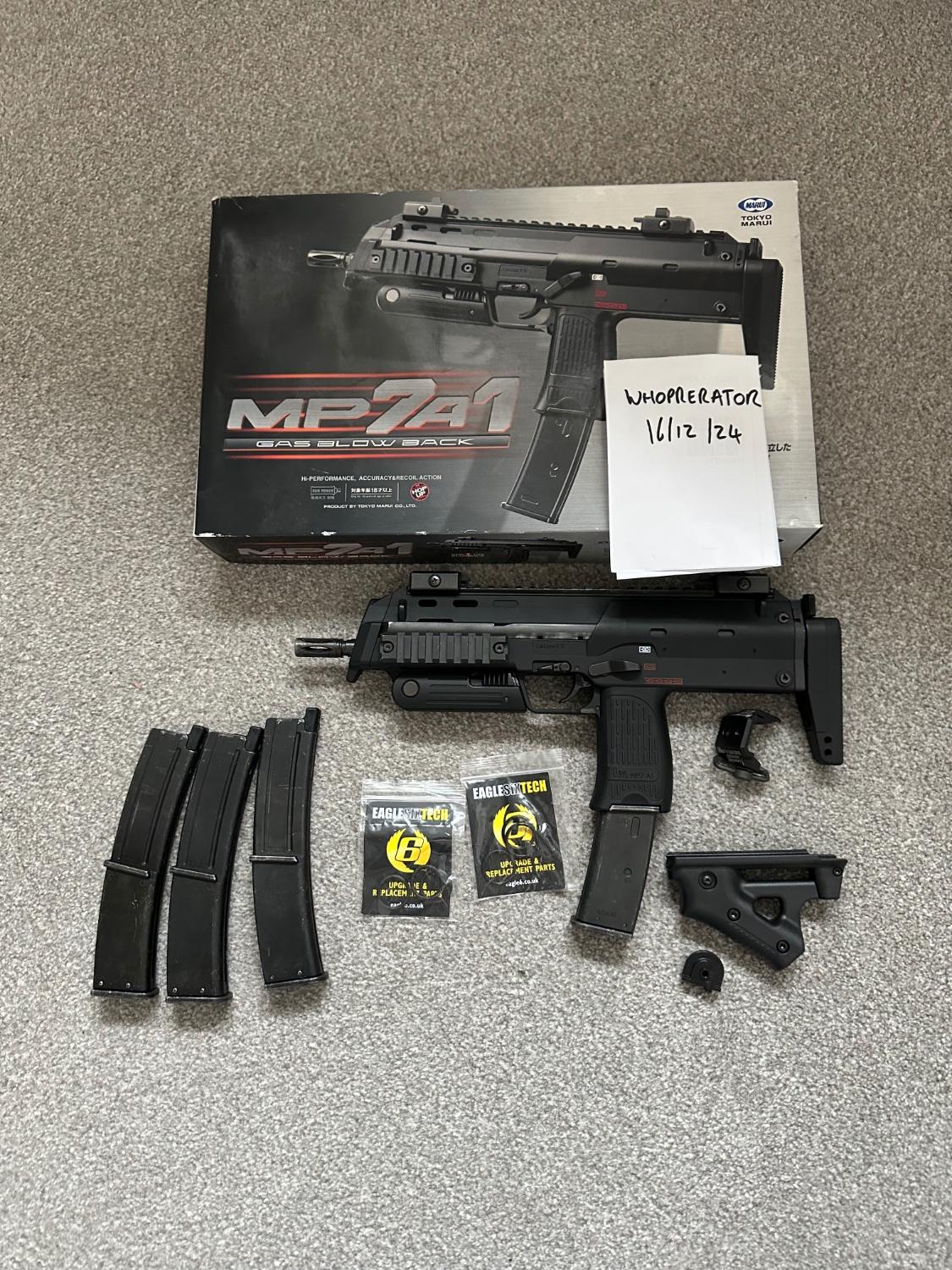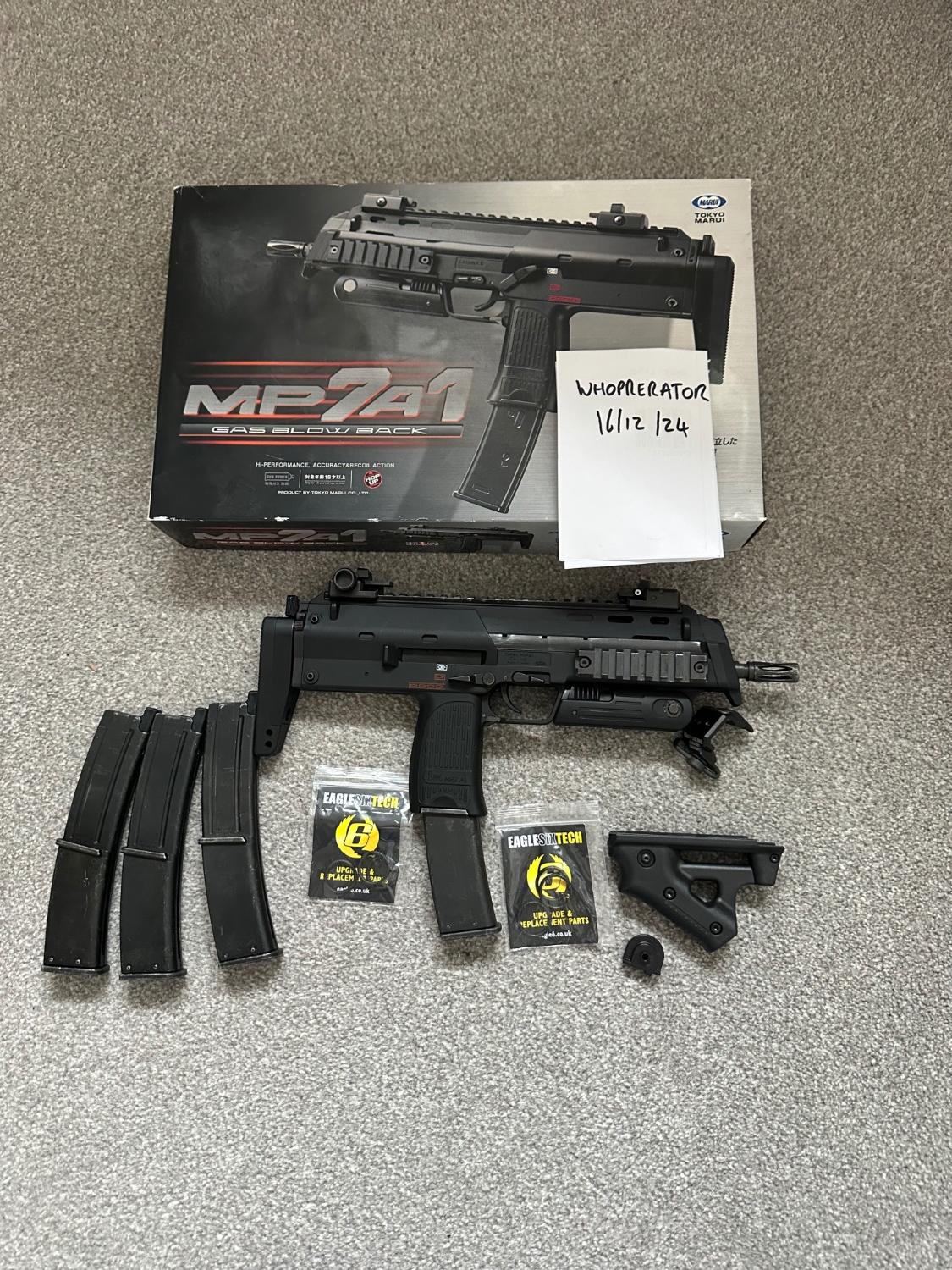 Tm mp7 a1 gbb for sale, shoots as expected on semi and full auto, bolt stop no longer functions. Comes with 3 gas tight magazines and 1 magazine needs a new fill valve but all have had new orings installed. There is also three spare orings included for any future requirement.  Includes spare front grip and sling swivel.