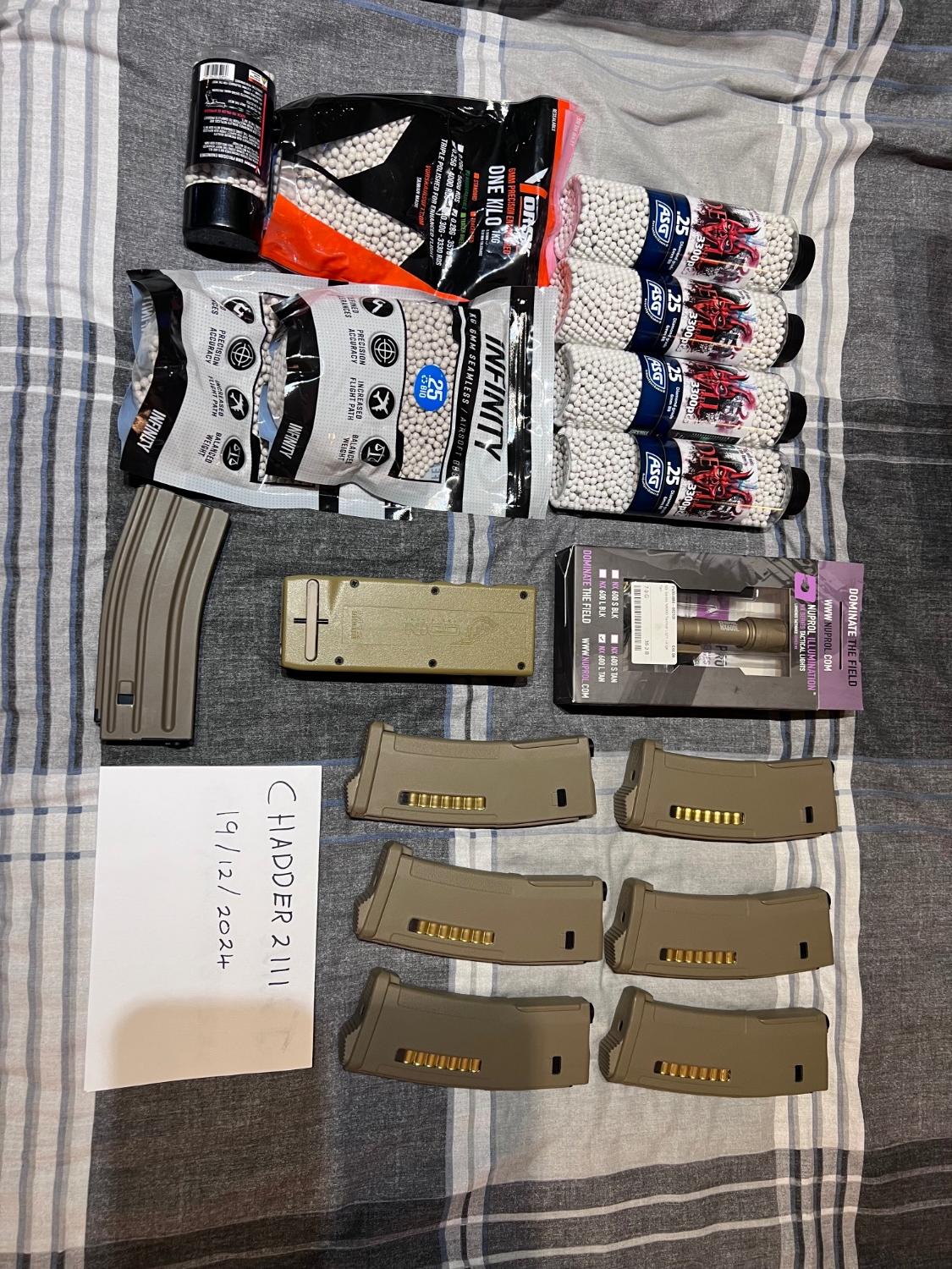 I am selling my Tokyo Marui Sacr-L in Tan, next gen AEG. Not played for a year so looking to sell my kit to someone who is looking to get into it, or to expand their collection. The rifle was purchased in March 2023 and has about 5-6 games on it. So it’s in really good condition with a few upgrades. Below I have listed all items for sale