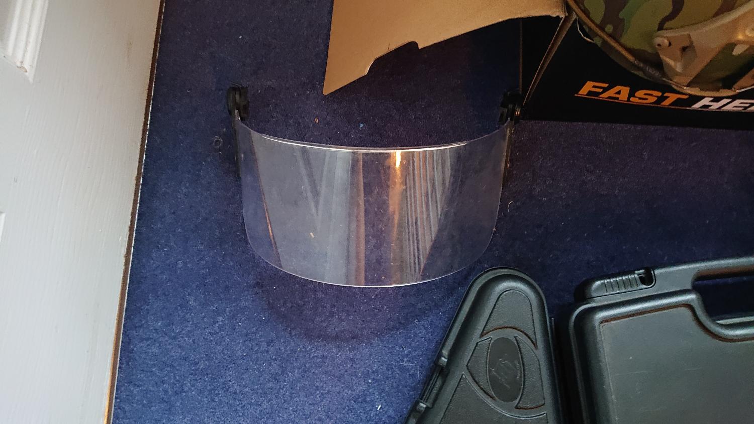 2- fast helmet mounted face shield. Some marks and minor scratches but works as it should. Attaches to standard fast helmet rails. Dont use this as eyepro on its own, use it with something underneath. £10