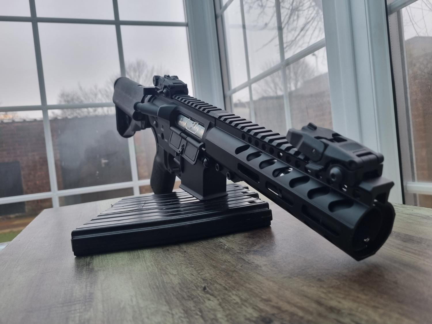 Has a real steel sling plate so it doesn't cover the AEG hole at the back