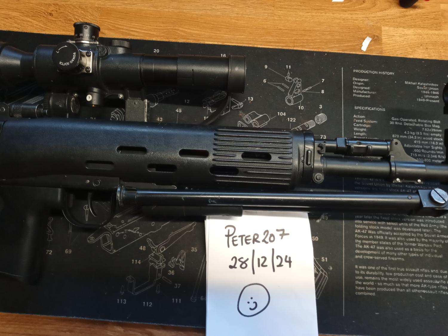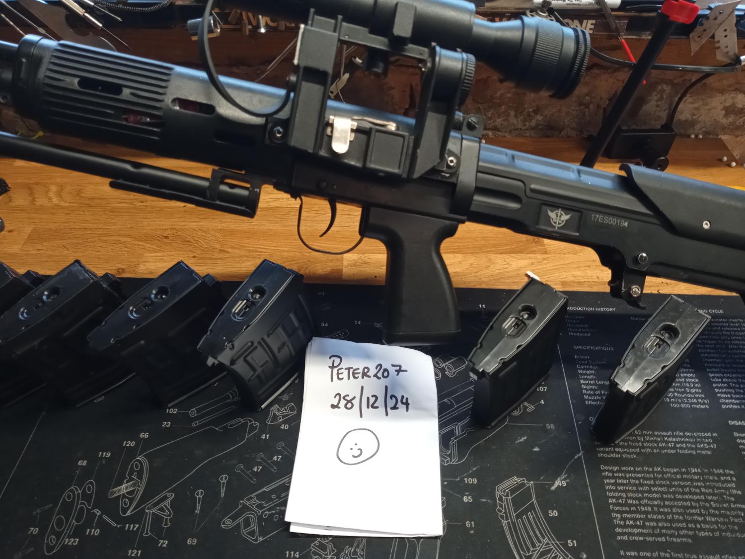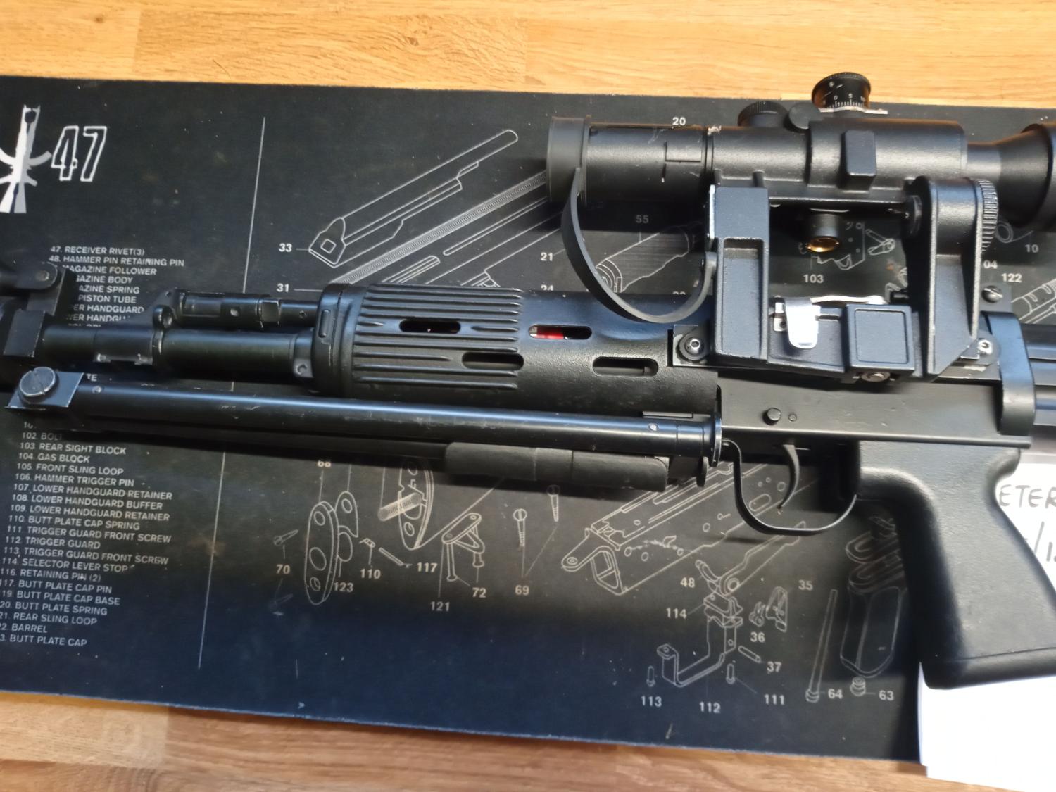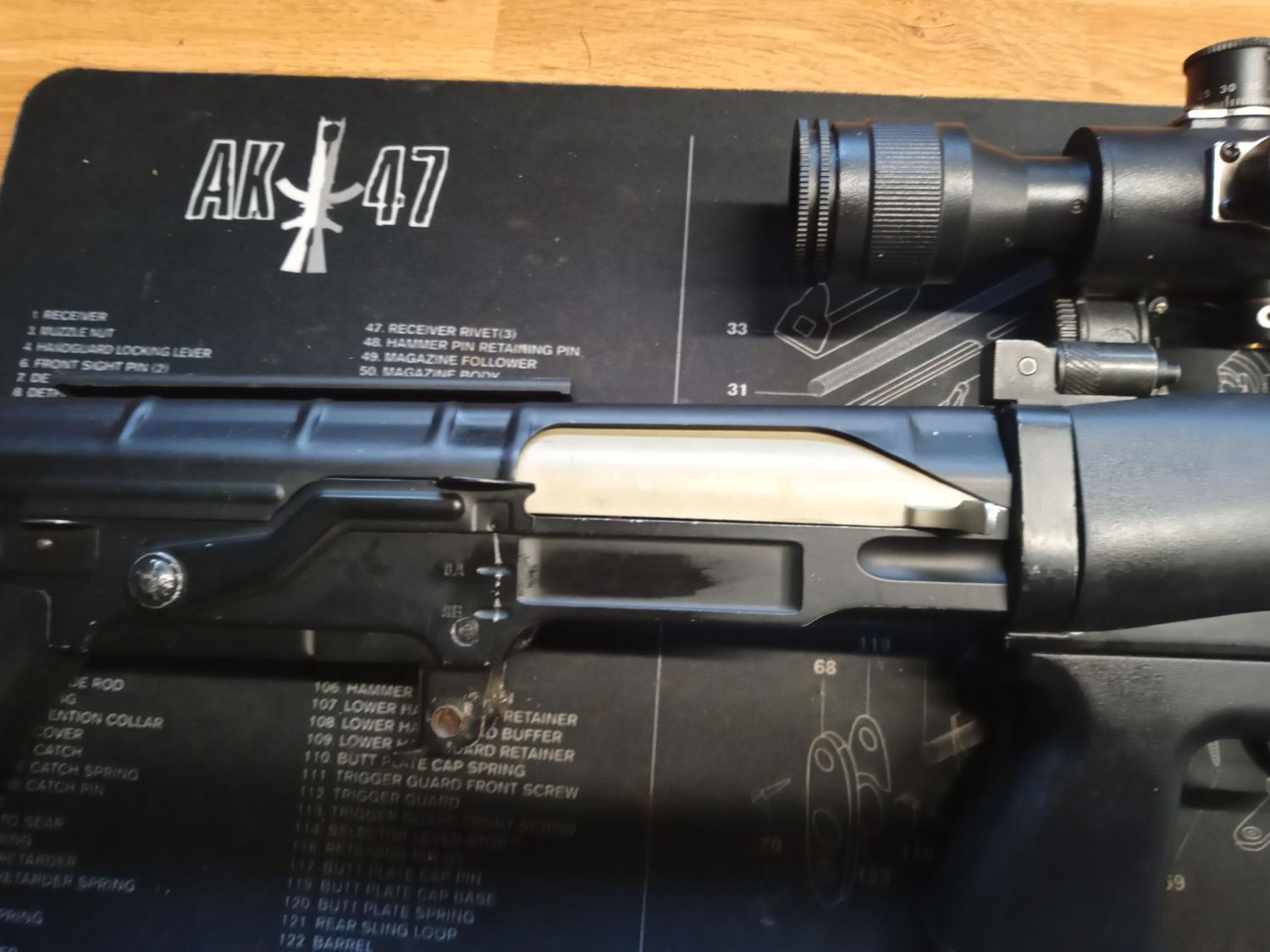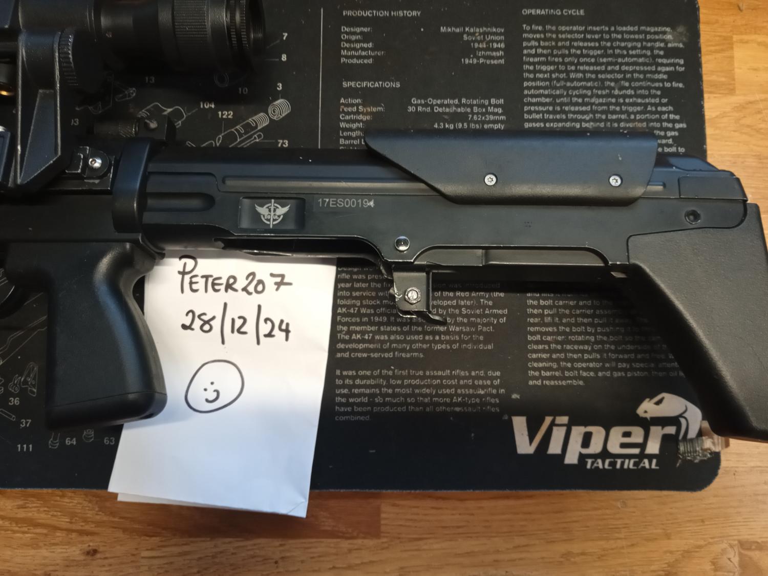 Time for another thinning of the herd! All the fun of a SVD with out the ridiculous length! Combat union CNC Hop up fitted. Probably changed the spring (I honestly can't remember) at some point. Locked to Semi as a DMR, which should be obvious from the FPS measured using 0.2s, although I recommend throwing something heaver with it. Mosfet fitted and wired to deans. Comes with the PSO replica scope, which lost it's light switch and light a while back, but really you don't need it do you? The mag release catch has had the useless pin replaced with something a bit more manly in bolt form. Mags are shimmed at tops to prevent wobble. Postage isn't included, but if I charge too much you get a refund! Please check my feedback for previous sales (and purchases). Payment is via paypal, pref F&F, but if you want to use Goods and Services, you pay the fee. Of course it goes without saying you must have a valid defence to buy a RIF.