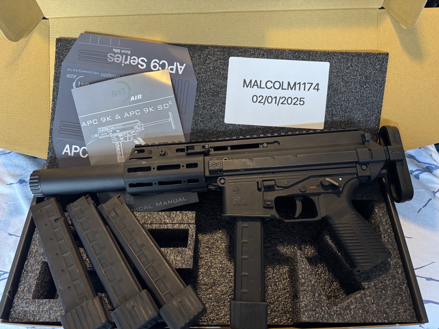 HI WELCOME TO THE SALE OF MY APC9 WHAT HAS HAD VERY LITTLE USE LIKE 2HS AT THE MOST,IM SELLING AS NOT BEING USED AND IM MORE IN TO PISTOL AND HPA,IT COMES WITH 4 GAS TIGHT MAGS UPRATED HOP RUBBER AND ALSO THE MANTA SUPPRESSOR COVER