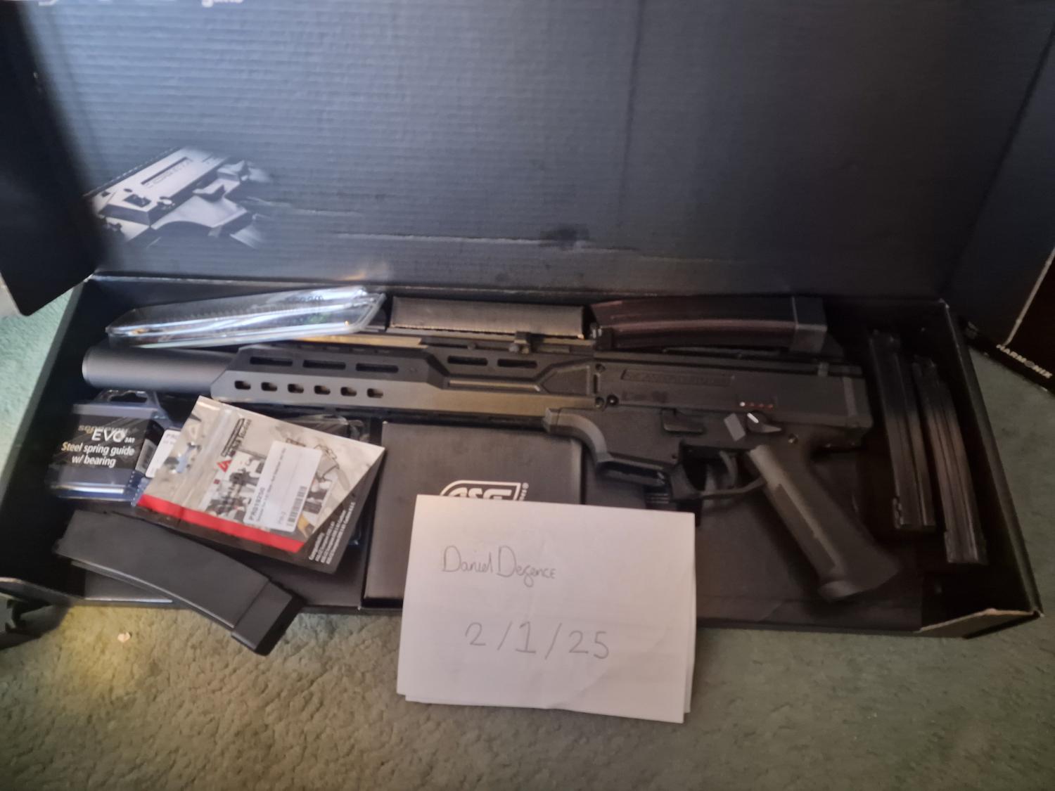 This has been used in 1 skirmish and has minor wear but gun works flawlessly on an 11.1. Awesome RIF but I decided that i prefer my other guns! Upgrades are: Airtech Studios stock stabiliser, steel spring guide with bearing, upgraded M105 spring (orginal spring is installed).