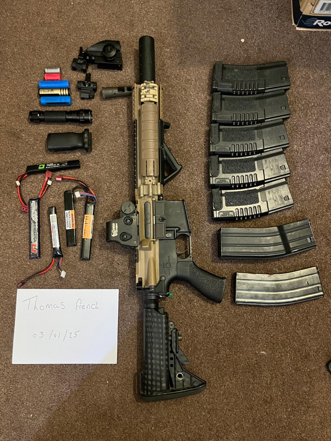Unknown top receiver but the bottom recover is from a G and G fire hawk. 6.01 tight bore with all the obvious external extras. 4 lipo batteries wired to deans. 5x mag pul 120rd mid caps. 1x 850rd pull cord mag and 1x 600rd pull cord mag. Comes with original iron sights and muzzle with additional grip and sight. Hasn't been used for over 18 months so likely needs a service. Was shooting 340fps last time i played. Comes with swiss arms carry case
