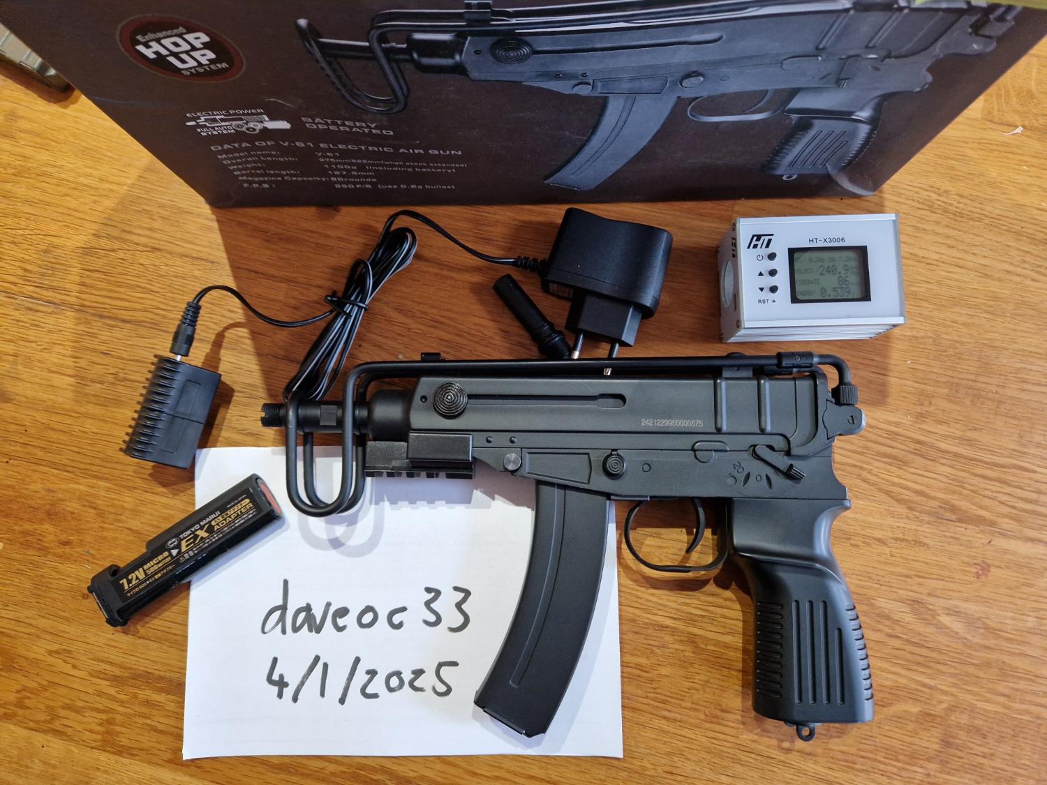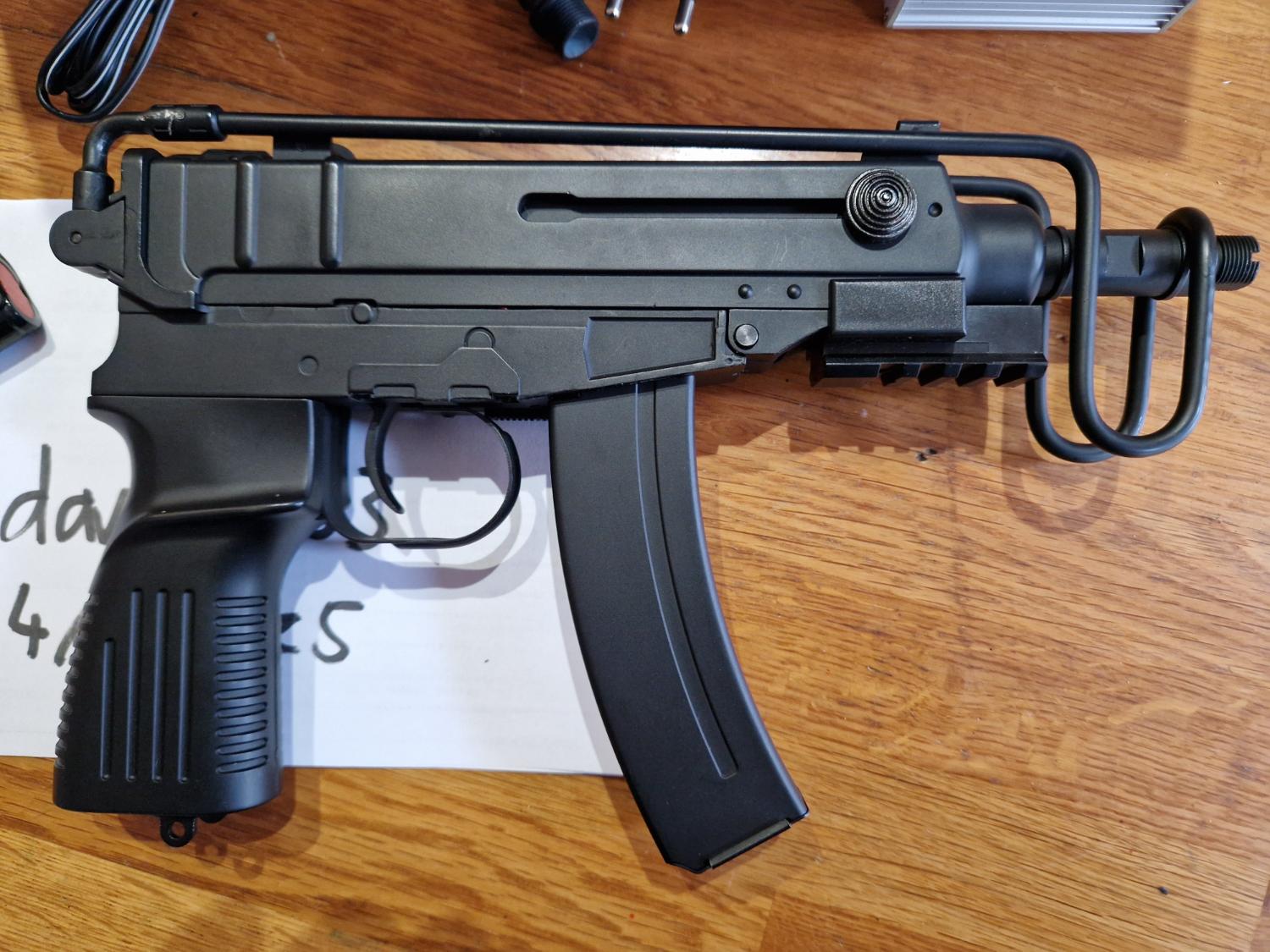 This is a JG Vz61 skorpion aeg / aep. It shoots around 240fps on a 0.2g bb. I used this as a sniper sidearm for a game day but that's it. It comes with a high cap mag, an aep battery and tm adapter so it's fits in the Vz61, and charger (2 pin charger). It has the threaded outer barrel fitted but comes with the non threaded one as well.