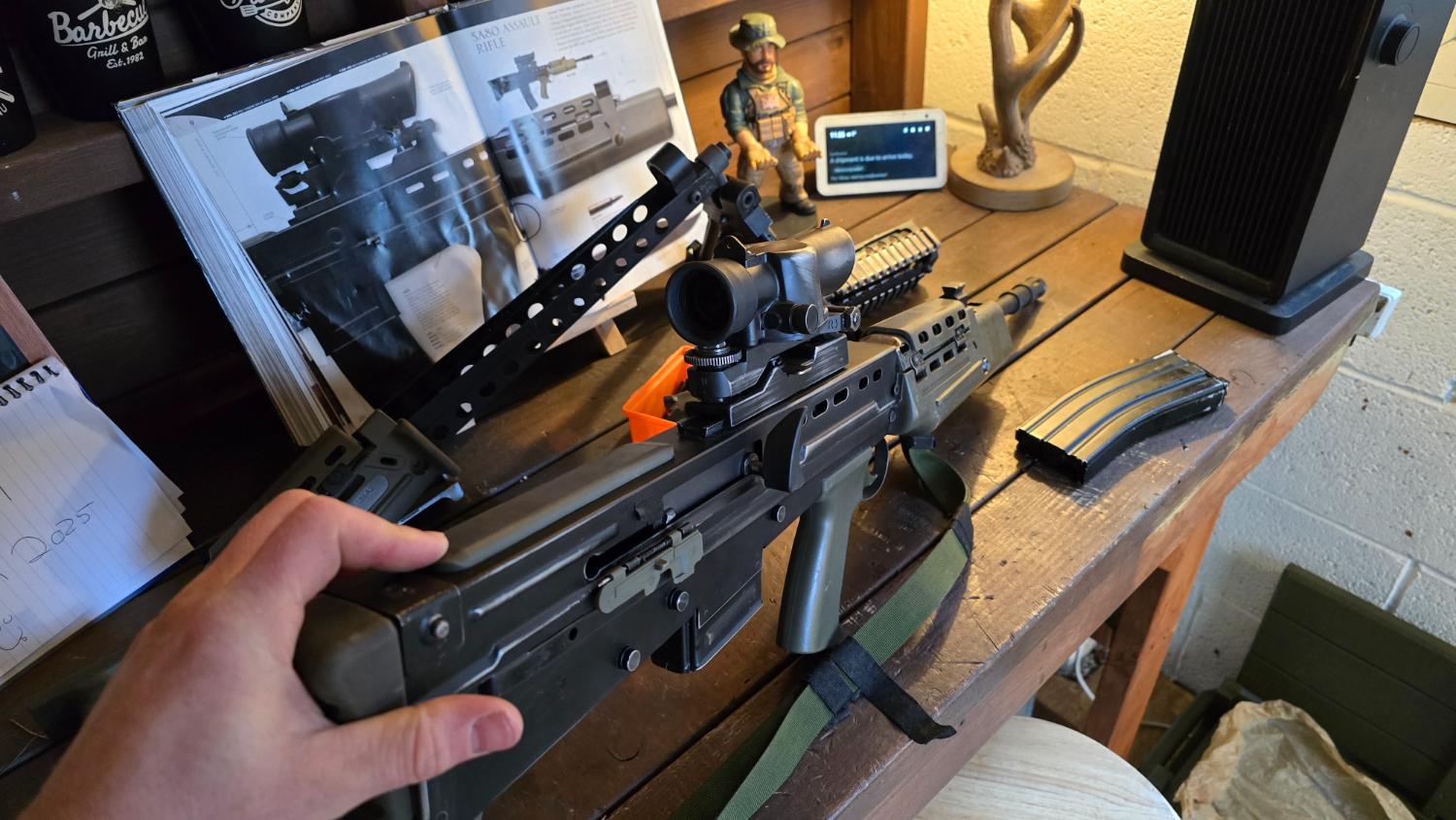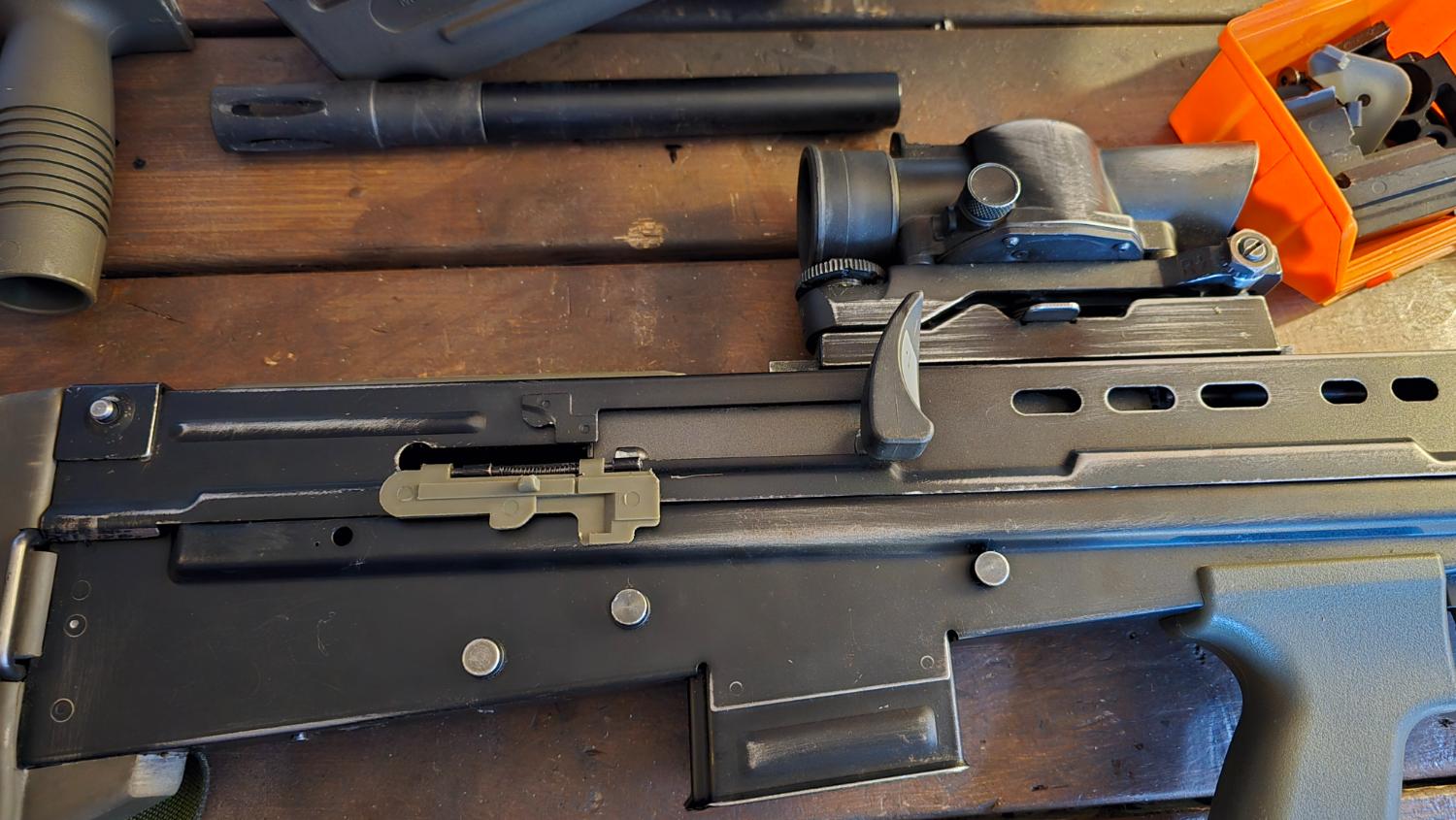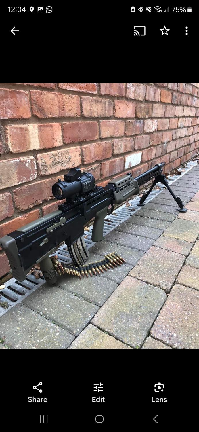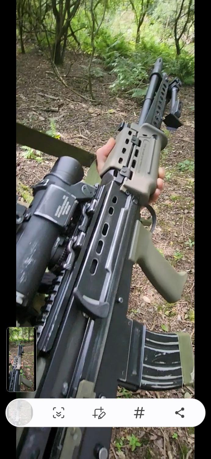 This is it's current set up, it has a real steel green hand guard, with upgraded reinforced steel backed bolt, with version 3 bolt woth magnetic NPAS (super stable fps), real steel sa80 sling and replica susat scope.
