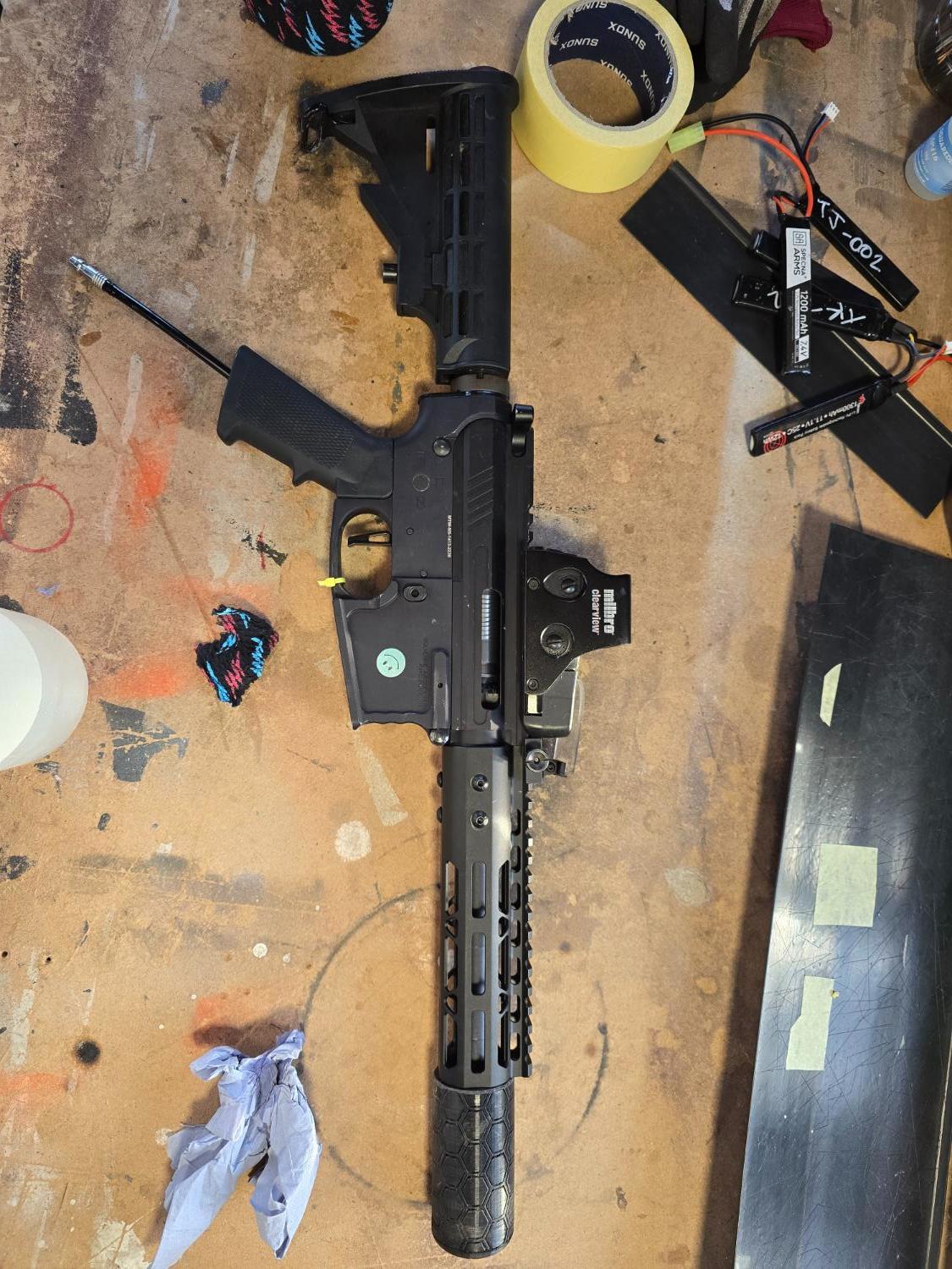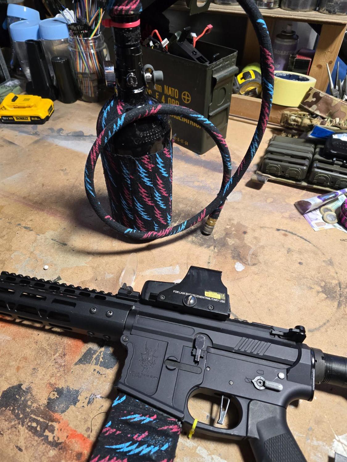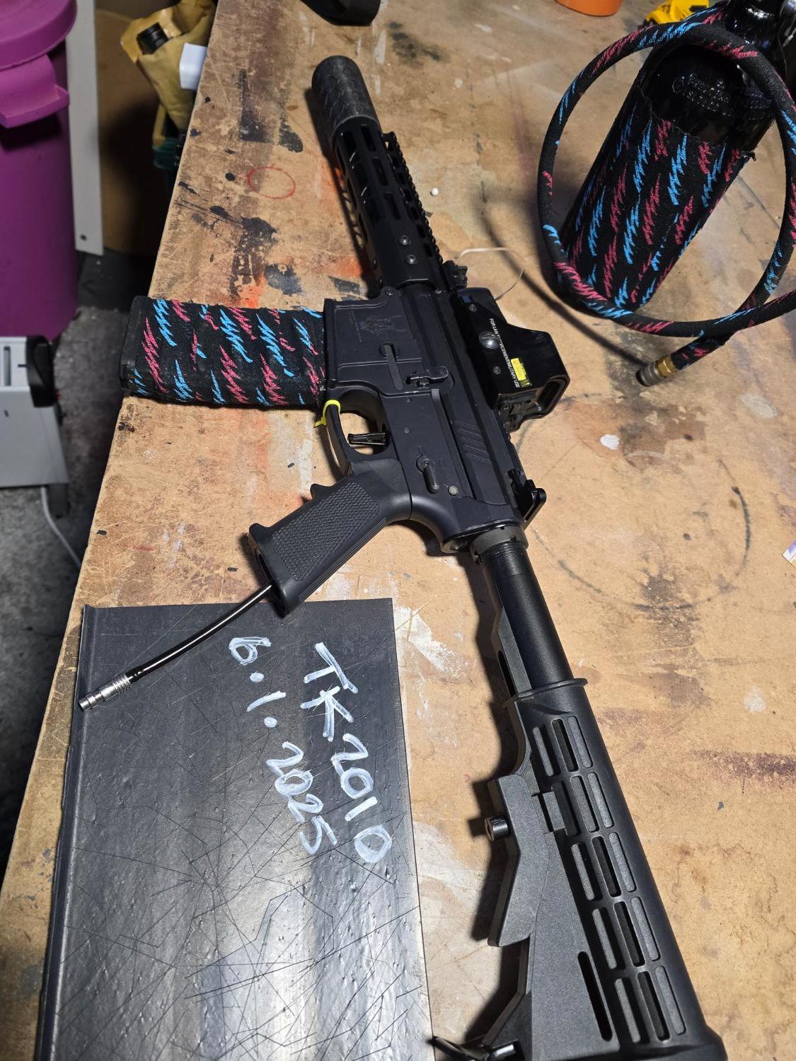Comes with everything in the picture, surpressor, sight protector, bottle (over a year left on it) , line (amped) and regulator (generic)... Ready to field.