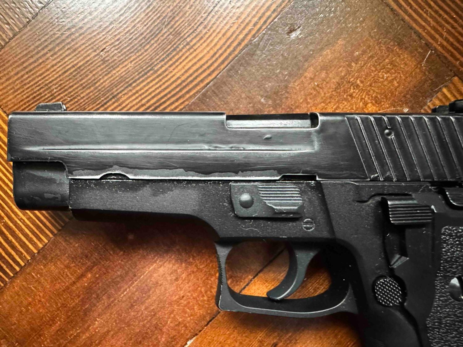 WE-Tech SIG P226 GBB. Ex-two tone blue (upper receiver) painted over in black. The metal top slide has been slightly weathered