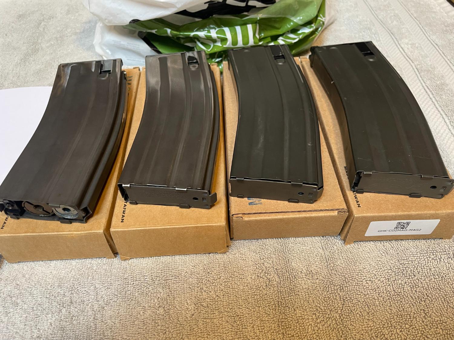 4 x GHK Co2 magazines and around 55 Co2 caplets, used in a Vipertech m4 2 of which were a bit tight so had to be sanded a little. 1 baseplate is missing. All work fine the only thing worth mentioning is the one on the far left had a tiny leak after installing the last caplet but stopped after a few seconds.