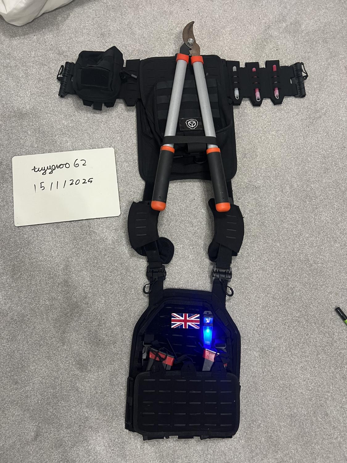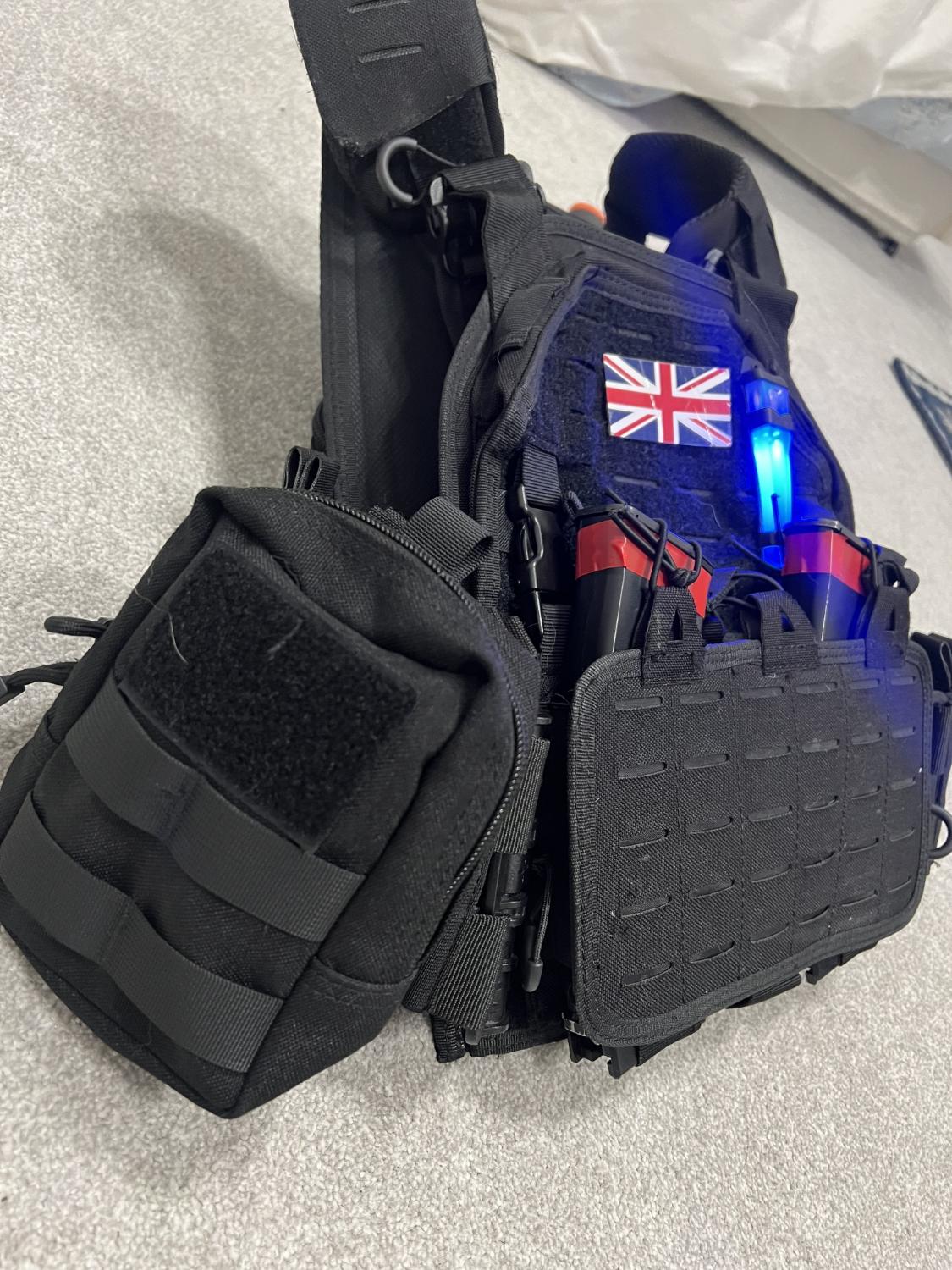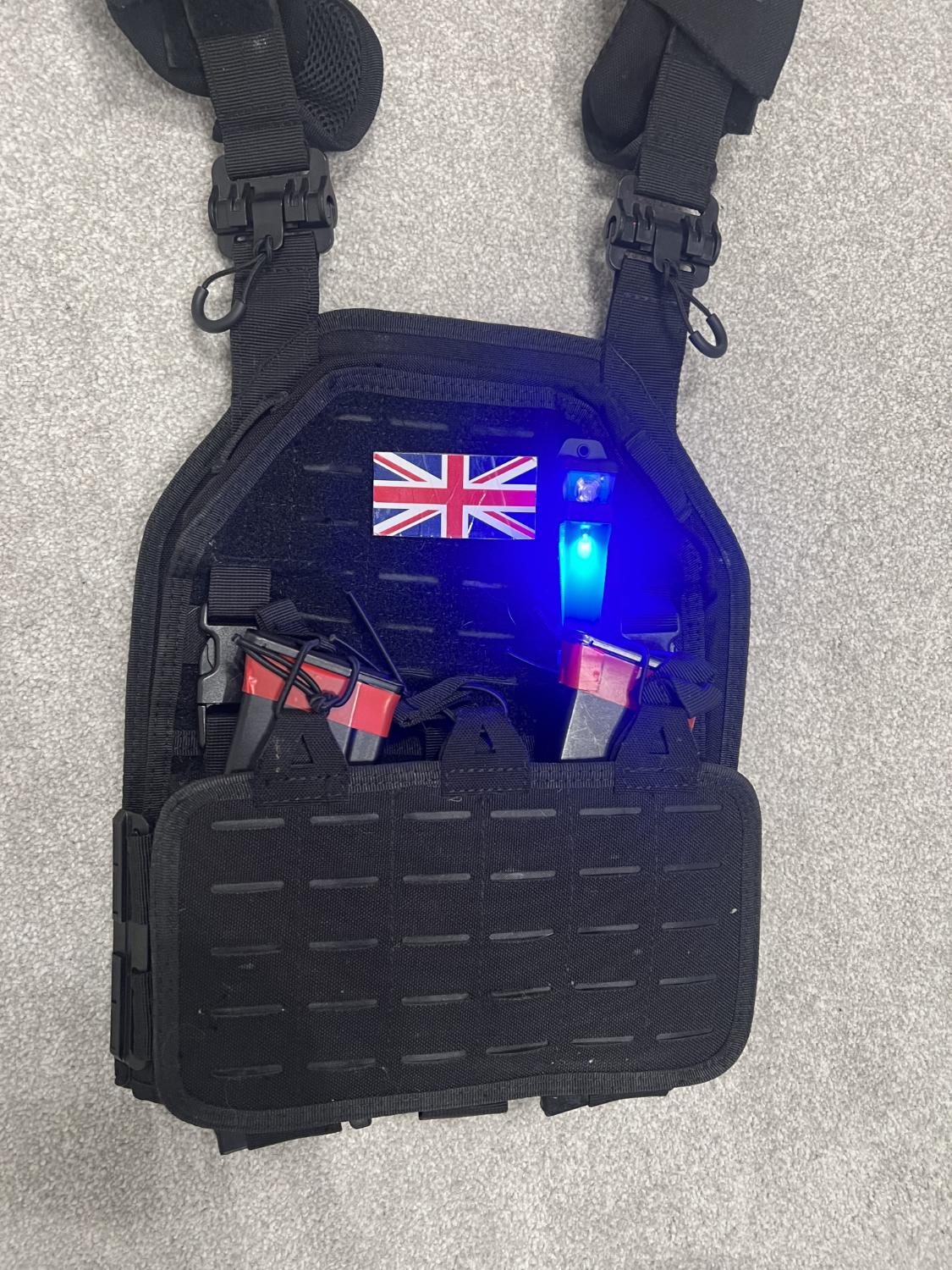 Included: tac lite british flag patch chemlights (which will be unused) additional pouch on left hand side large back pouch with SCP patch on it front mag pouch square