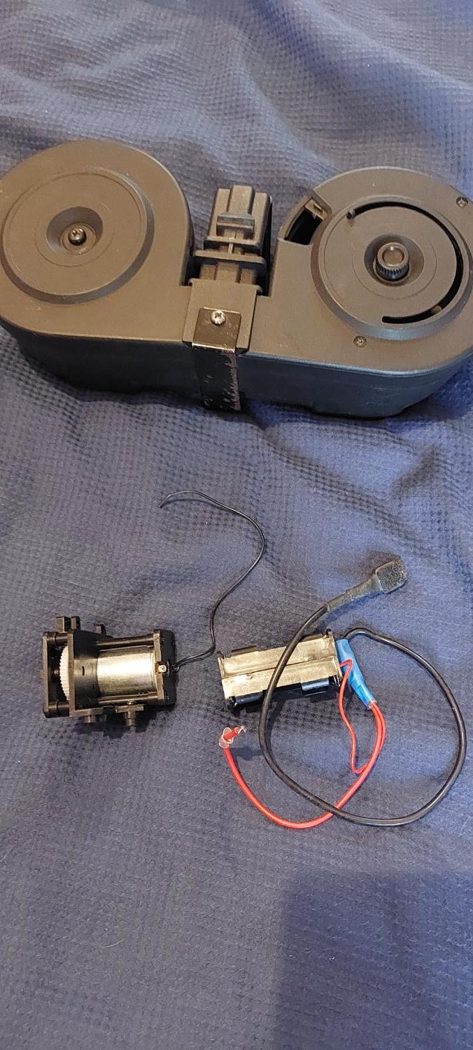 Drum mag - needs some soldering work doing to make it work again. The soldering points are on the positive wire on the motor and the negative wire to the battery holder. It seems fairly easy to do but my soldering skills are about as good as my ice skating skills - and i've never been ice skating......