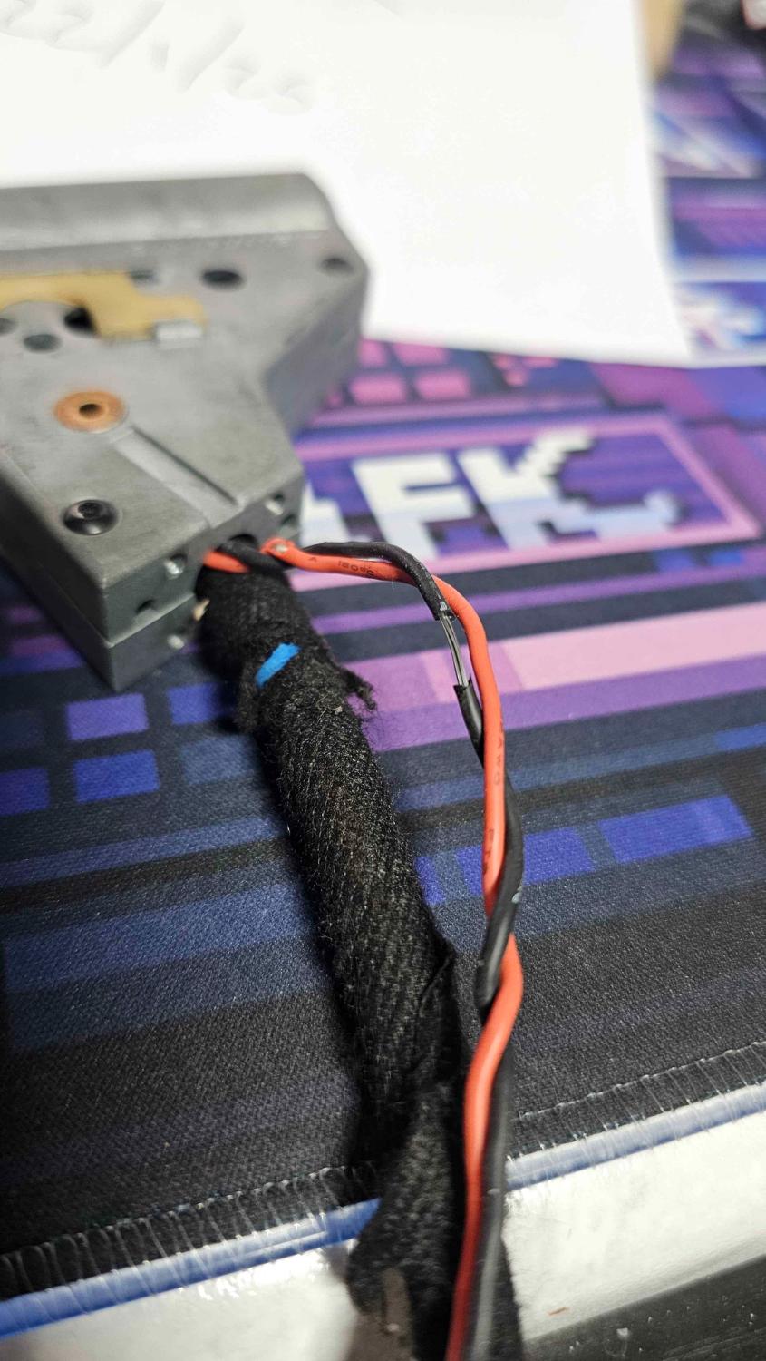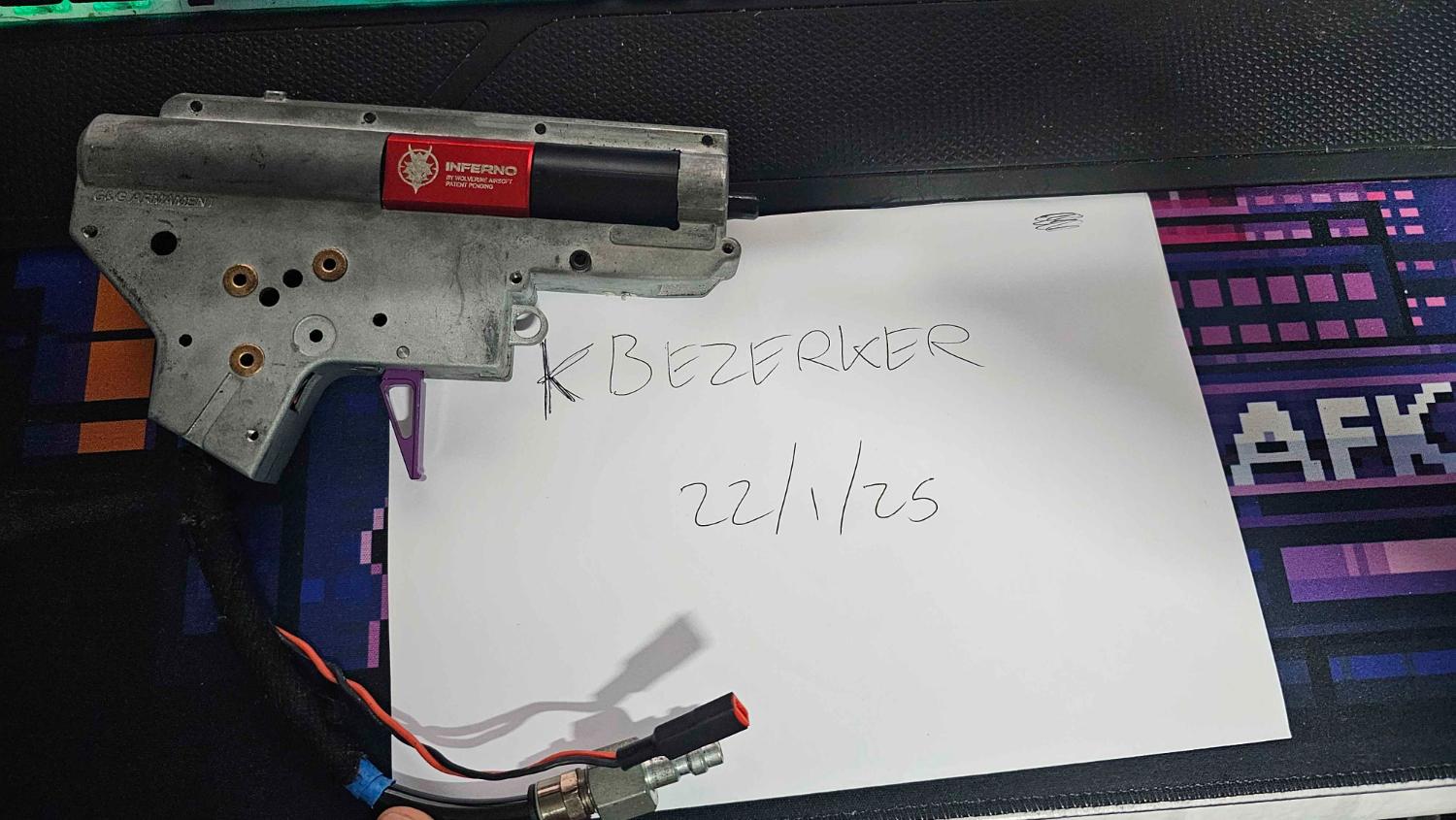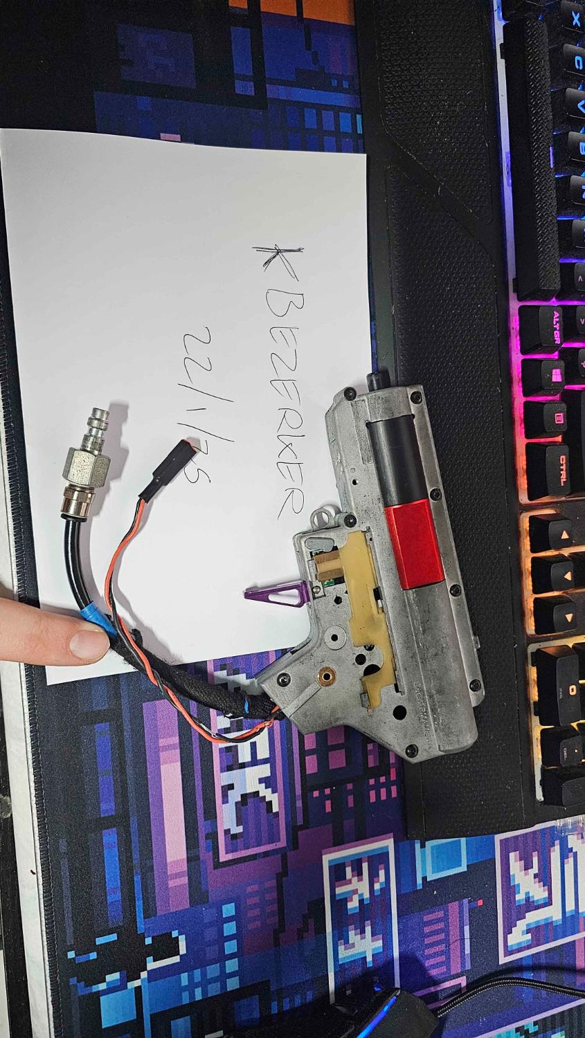 The engine is fully assembled in a G&G combat machine gearbox with the hose and battery line that goes down into the pistol grip of the gun.