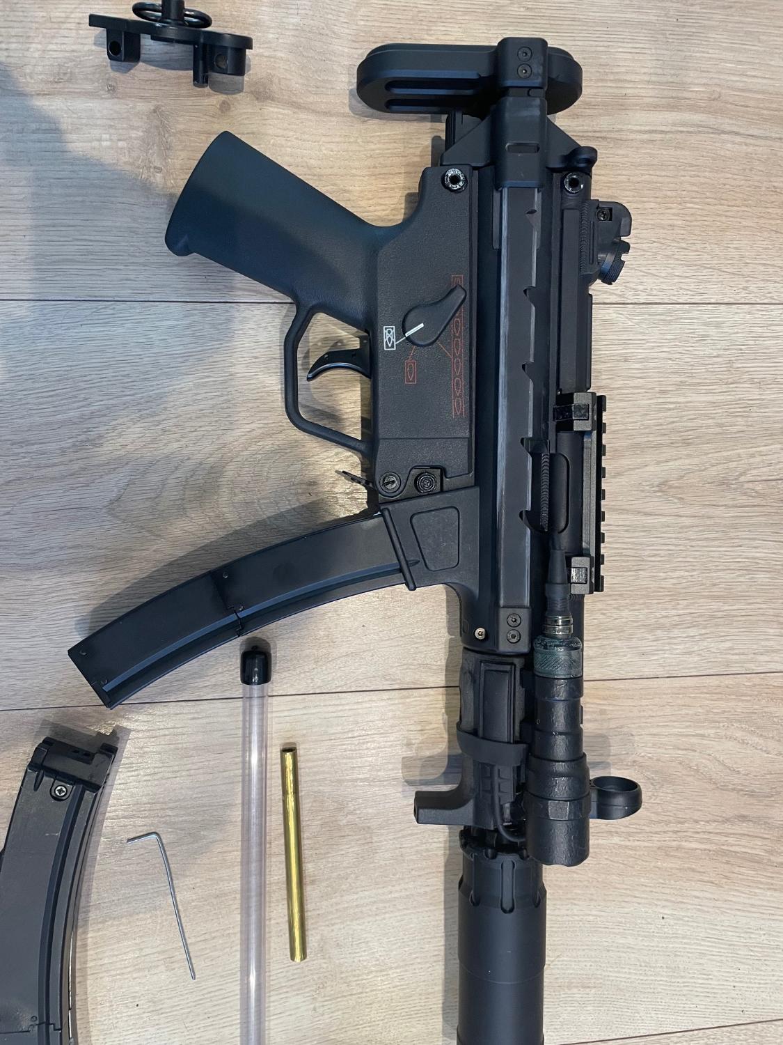 Well g55 gas mp5k, 2 gas tight mags, longer inner barrel (265mm), maple leaf 60 hop rubber, bowmaster stock,top rail, mag clamp, barrel runs through the 3d supressor, very rapid pew, £160 posted including pp fees