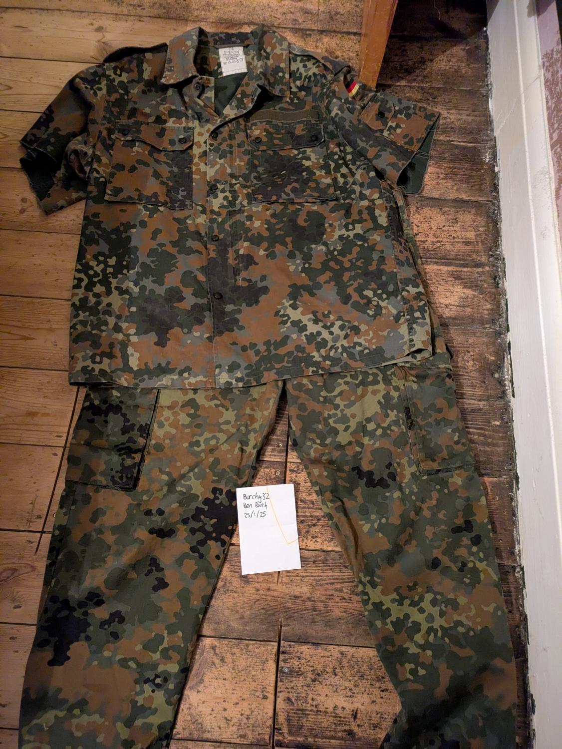 Flecktarn camo- shirt £5 (cut sleeves, equivalent to XL) trousers (equivalent to 40/42") £15
