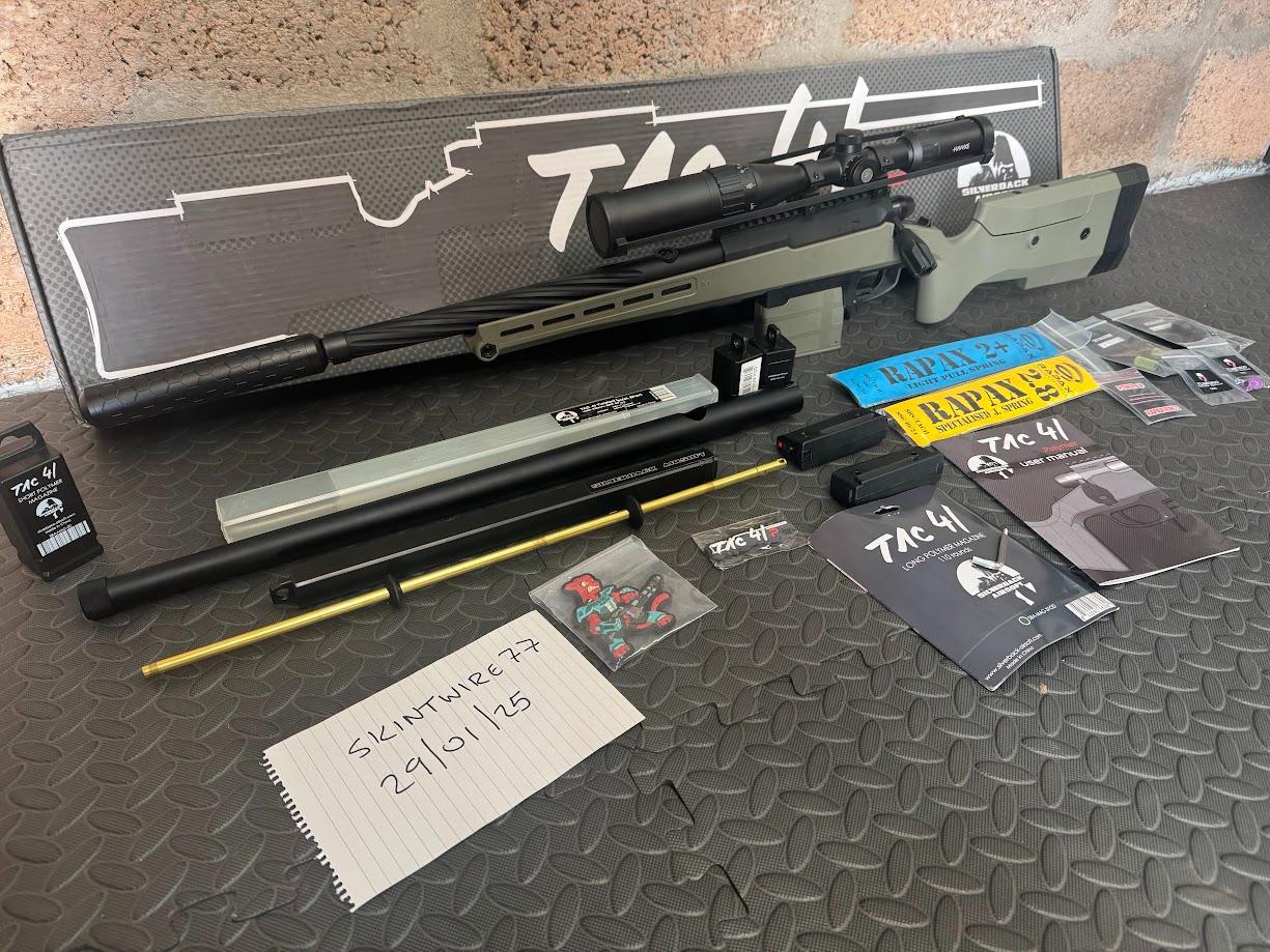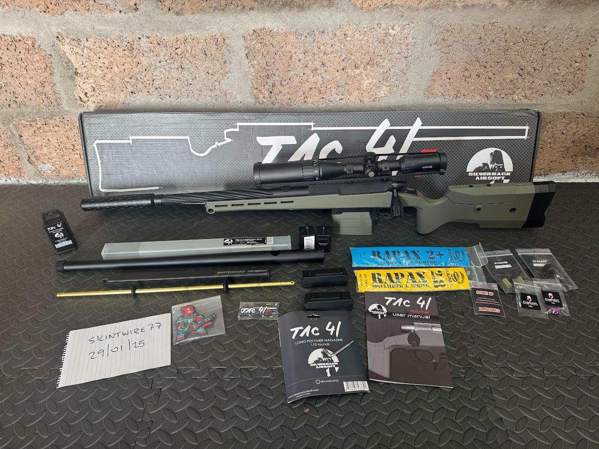 Everything in the pictures is included. Original Tac41-P bought from LandWarrior in Edinburgh. Currently fitted with the Silverback short fluted outer barrel and silverback inner barrel. The scope is a Hawke Vantage IR and the suppressor is the Sniper Mechanics Hexx Long. The piston is upgraded with Rapax spring and Silverback Advanced piston head. There are Stalker glide rings installed too. The TDC has the Chub Nub installed. Flamingo bucking fitted.
