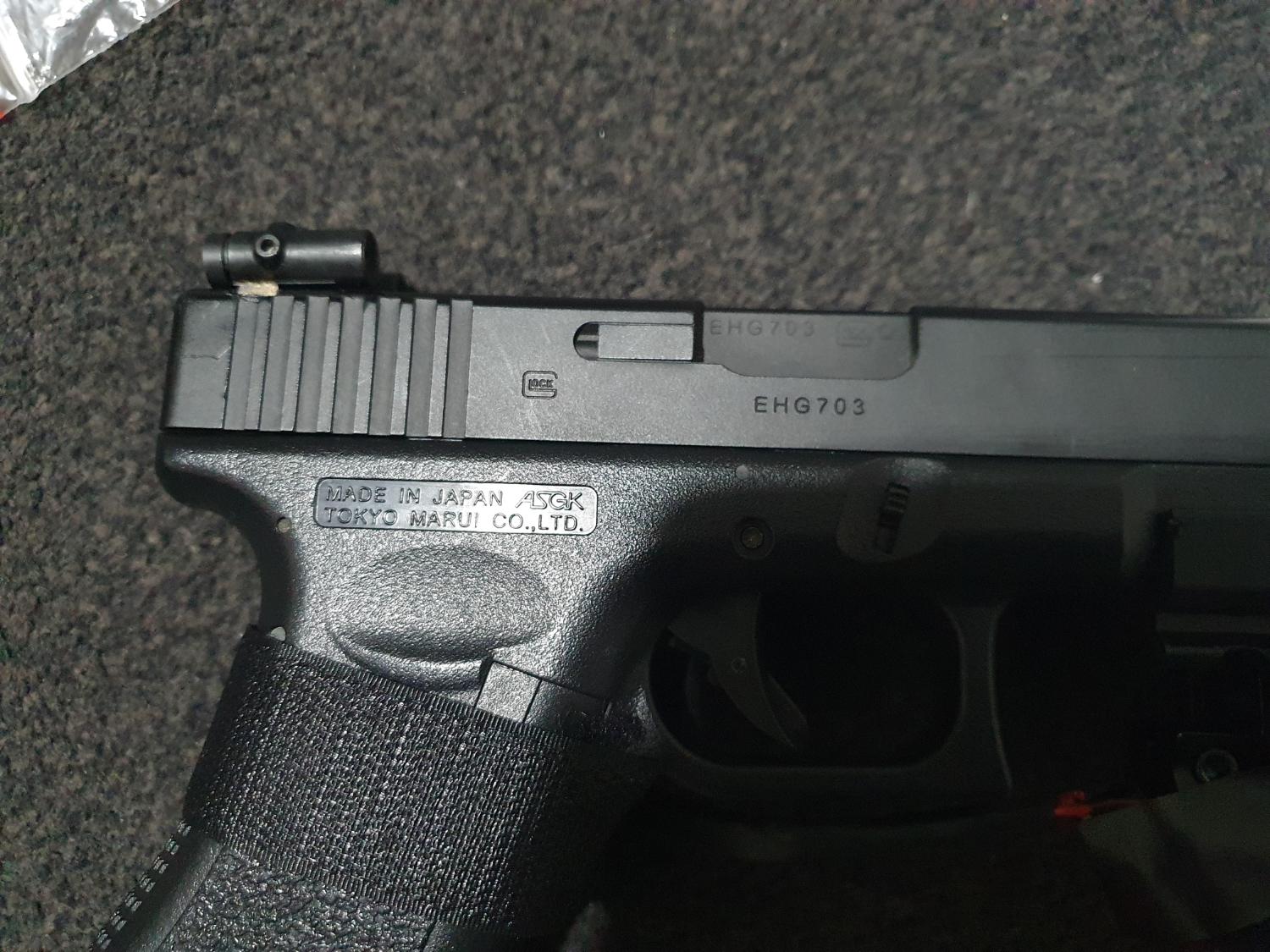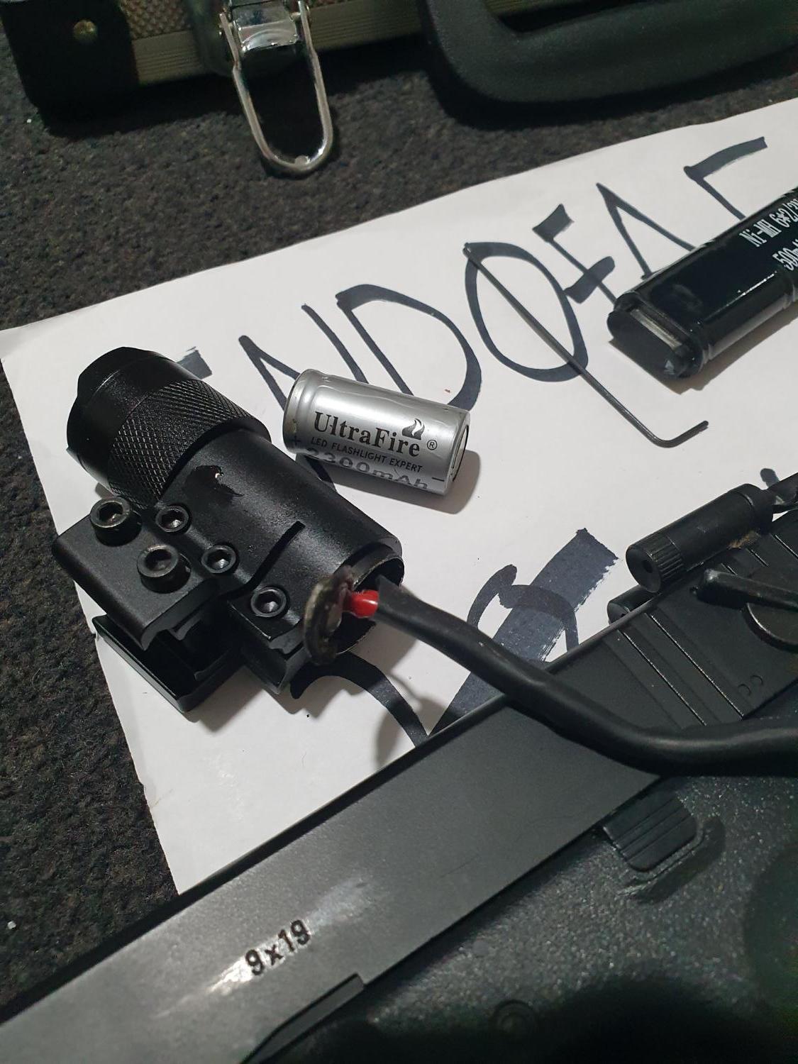 Here is my CQB side arm, built on a trusty TM G18 it has a tiny laser built into the rear sight, the original broke so easily and only had on, so once you put the batteries in, it just drained until they died, it wasnt a very practical method so i installed a momentary switch, the wires are alittle untidy but its better than switching out the batteries every hour. I also made a super bright short torch also with a momentary switch so you can illumiate your surroundings for just a second and dissappear into the darkness again, both switches are located within reach of the thumb so you can choose with you want to use and still reach the mag release without issue, as you can see in the video...