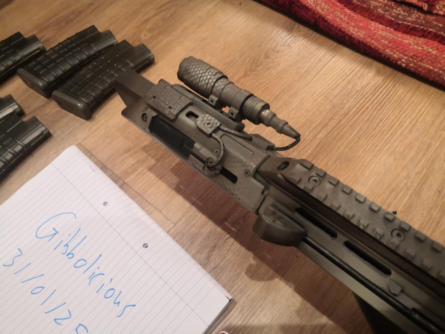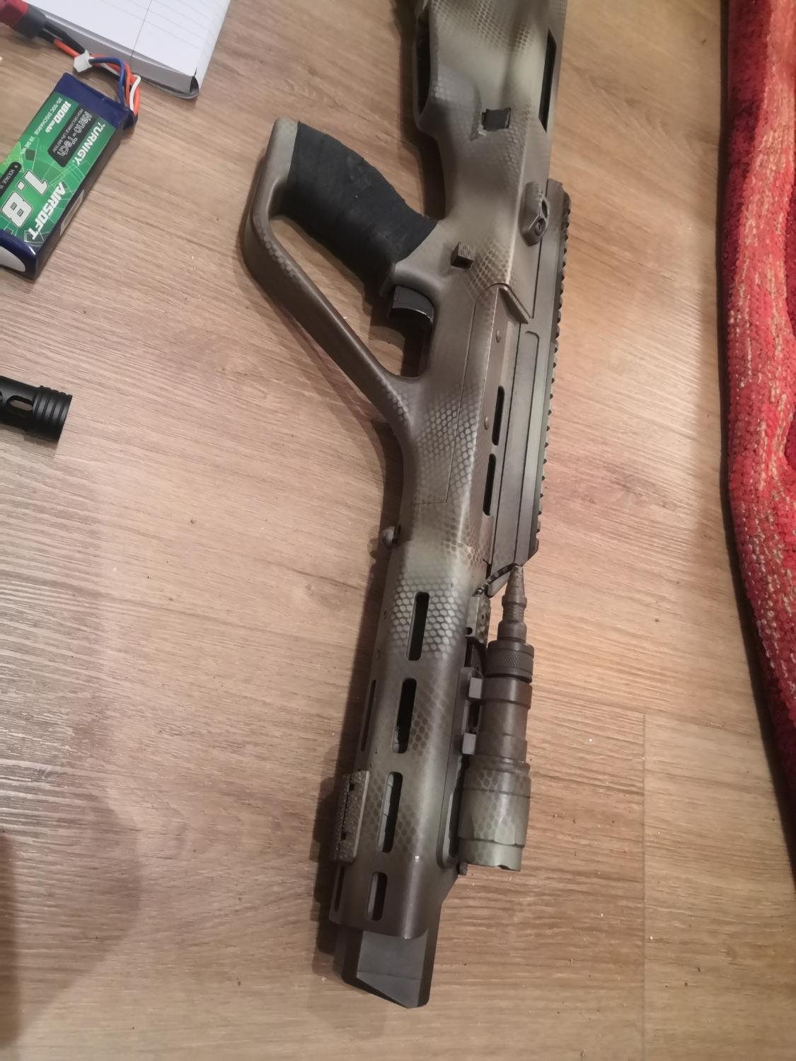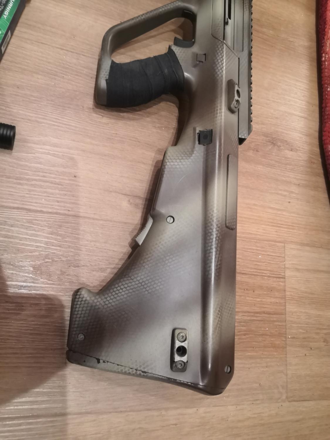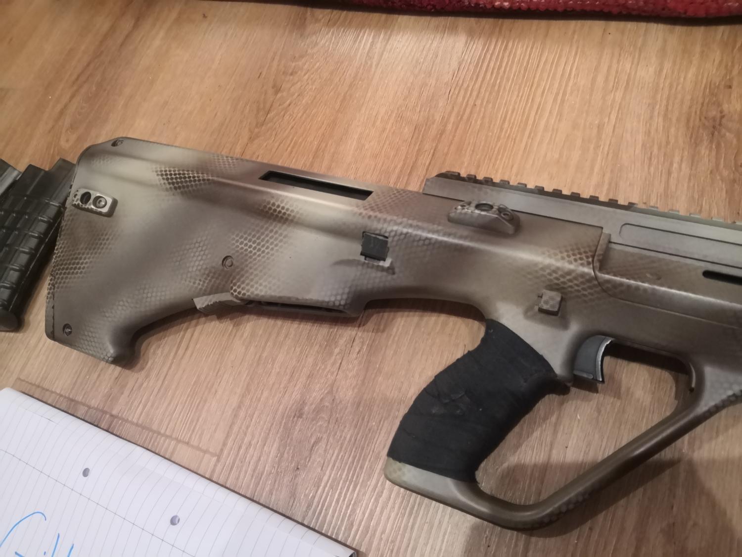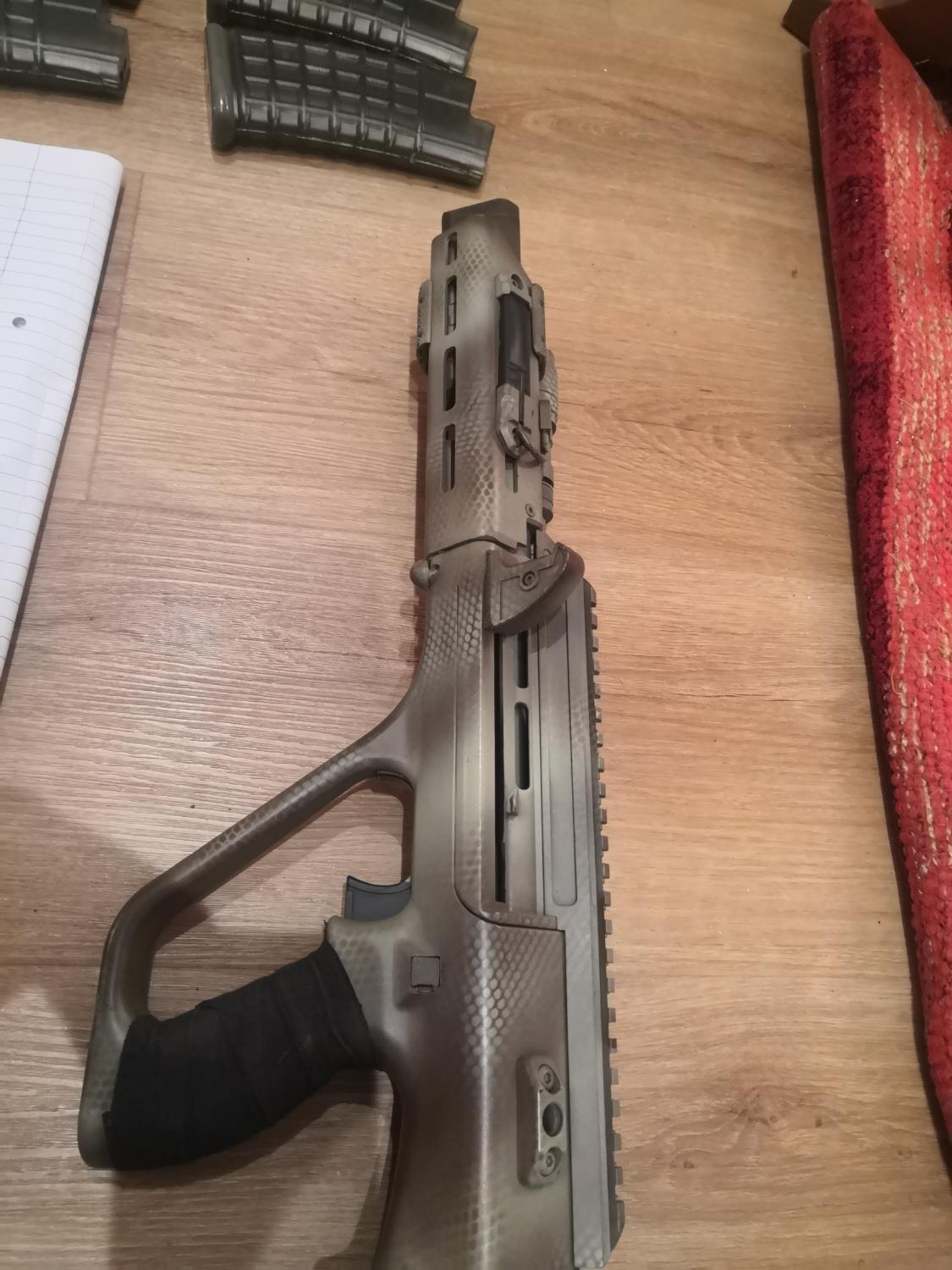 The fire selector has also been modified to allow for a semi position. Along with shortening the trigger pull, and slightly slackening off the trigger strength, you can pull off some quick semi shots despite the bullpup trigger, without the risk of going into full auto. So now the selector positions are like this: safe-semi-(semi-full)