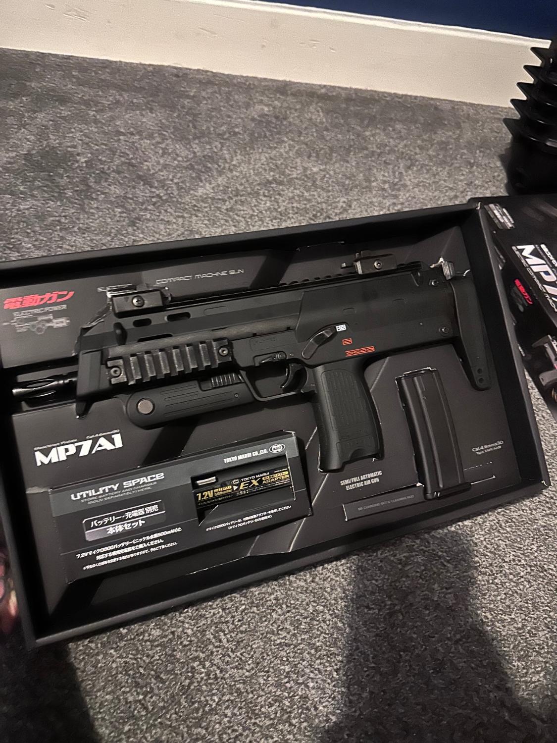 Hi everyone I have for sale my Tokyo Marui MP7 AEP used for 1 CQB game and that’s it comes with everything seen boxed paperwork and other Marui goodness comes with 1 standard 50 round magazine and 2 Tokyo Marui high cap magazines and a MAG 100 round mid cap magazine and battery adapter and battery included ? wanting £200 plus postage but open to offers ore trade for any other TM SMG any questions please ask I can provide more pics and a video of it shooting my email is [email protected] ore text me for a quicker response on 07530689244
