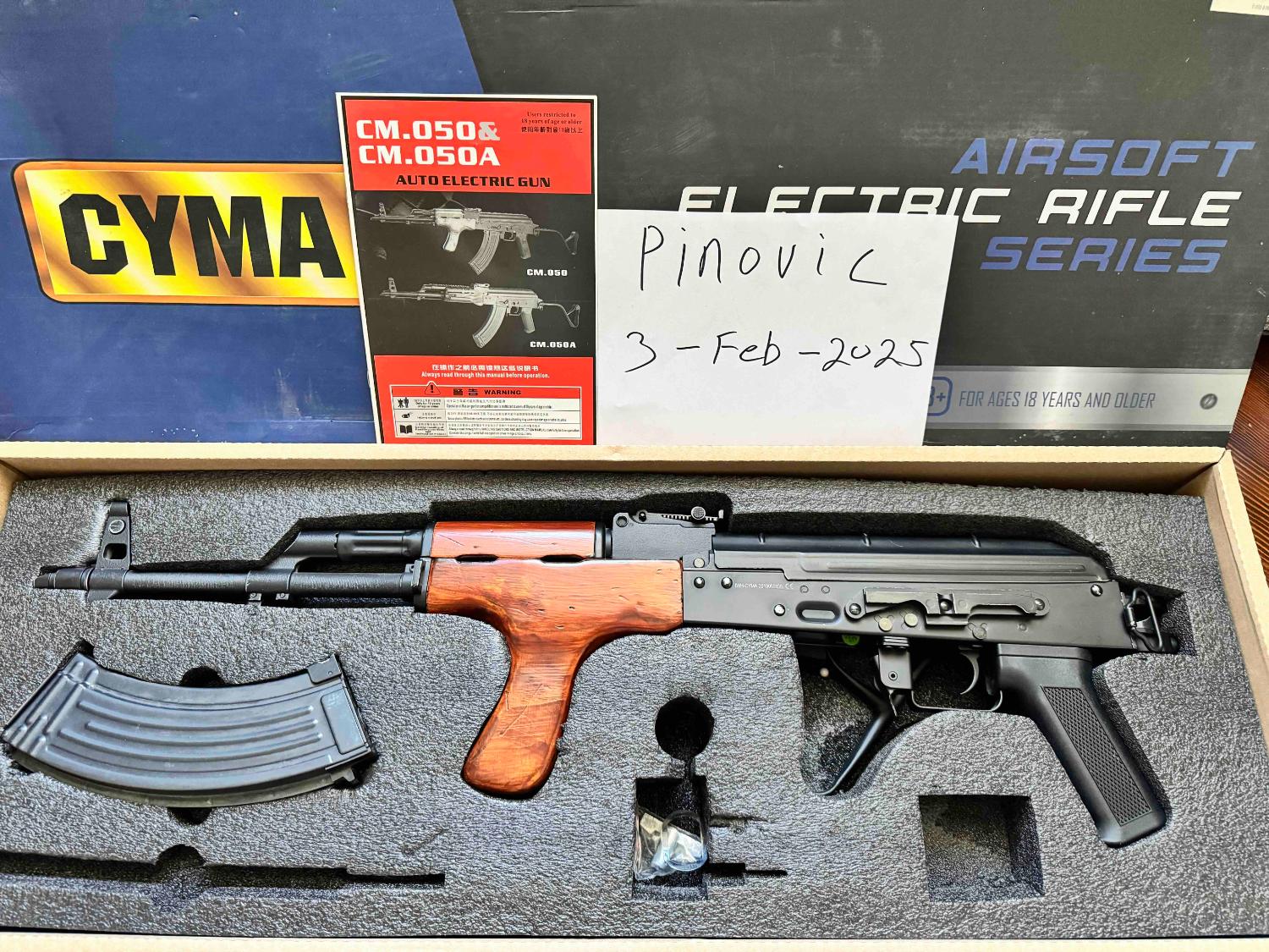 For sale is a Cyma CM050 AIMS EBB Romanian AK. It features real wood furnishings and a metal body.