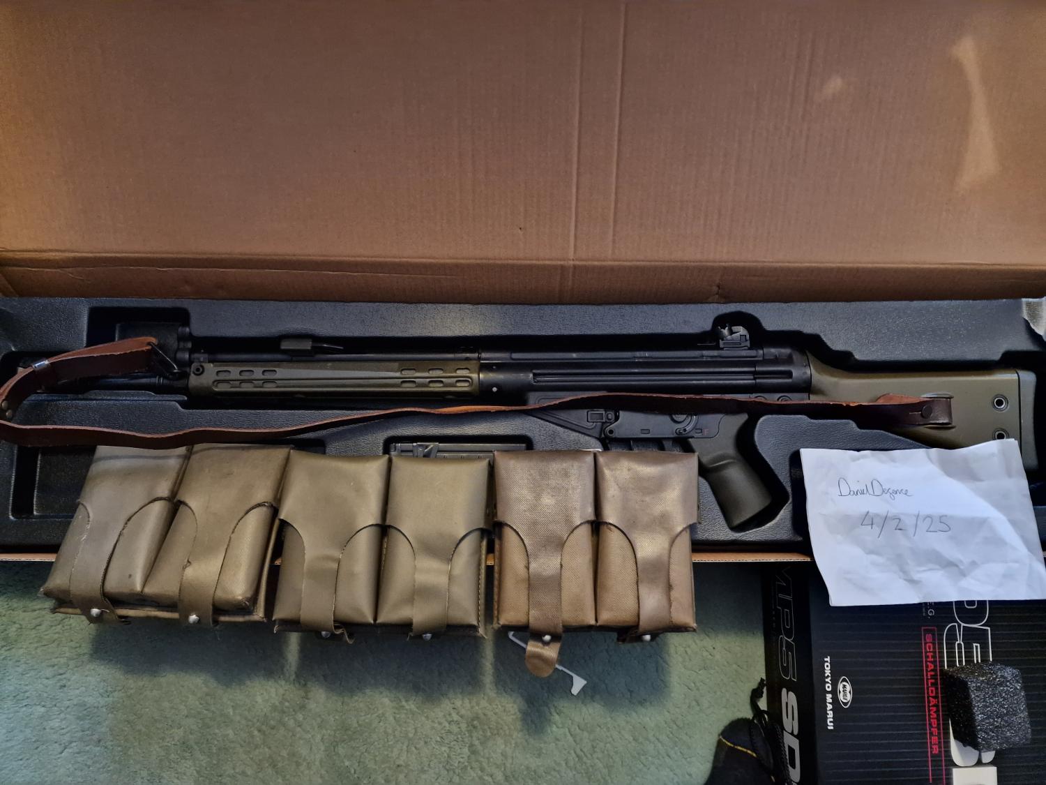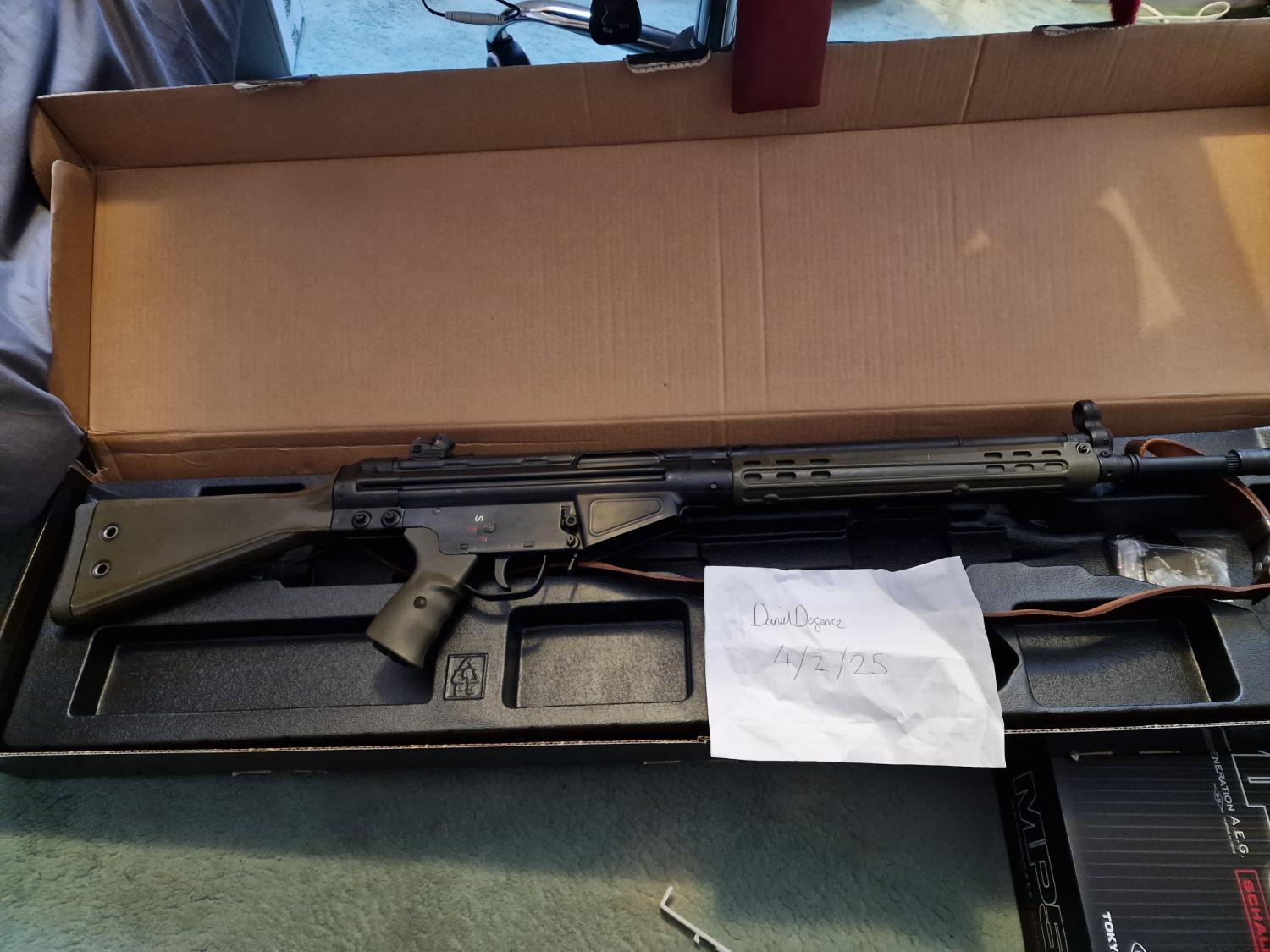 This is an incredible labour of love if I'm honest. An LCT G3 upgraded with a basic acetech mosfet (deans connector) and with numerous real steel parts that include: the handguard and stock (stock buttplate has been modified to fit), the rear drum sight, sling and 3 double german G3 mag pouches with 6 mid caps. An incredible piece which I am reluctant to let go of. Also includes a spare tappet plate.