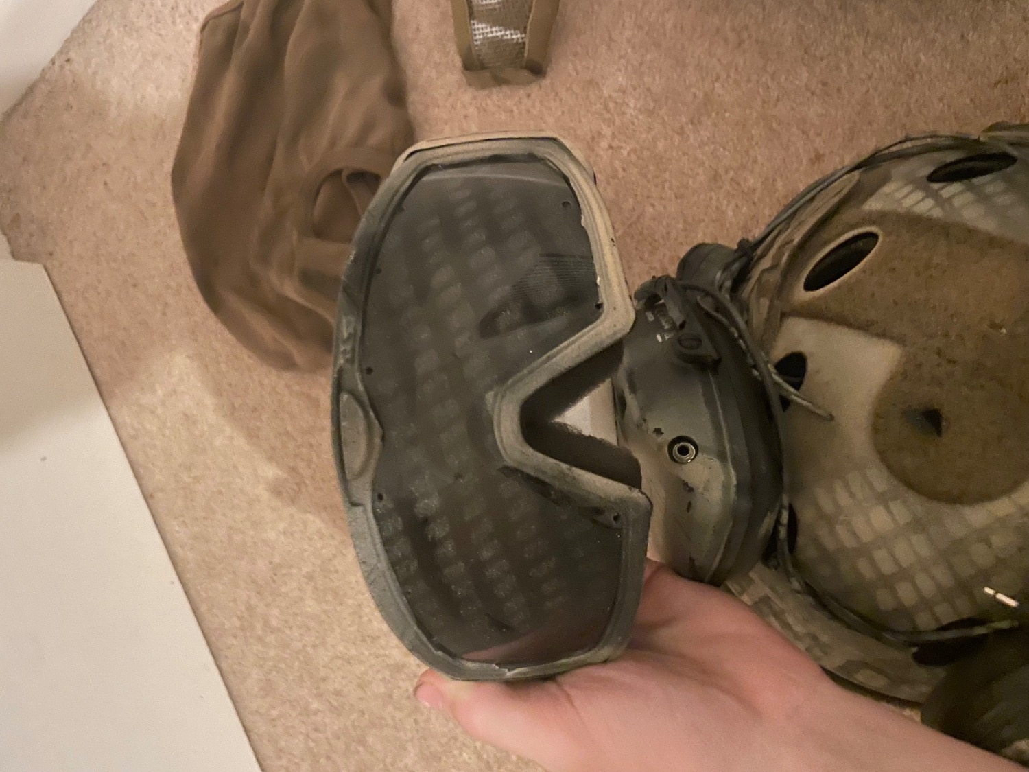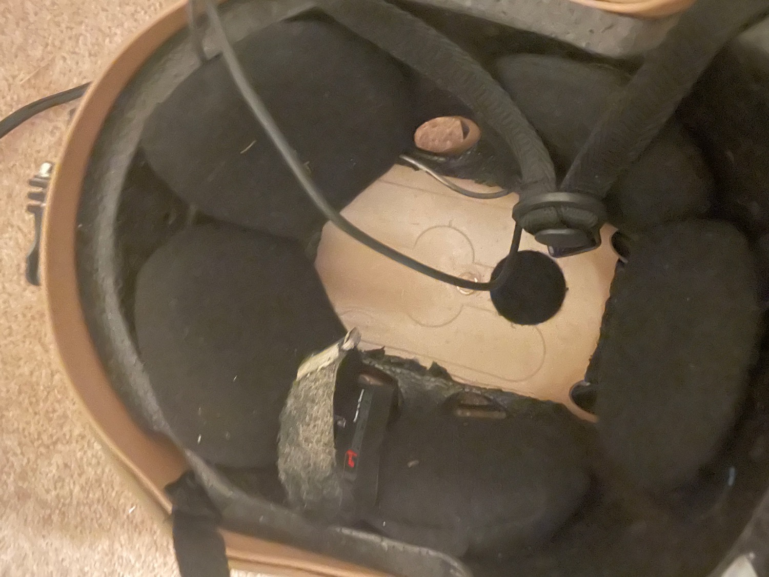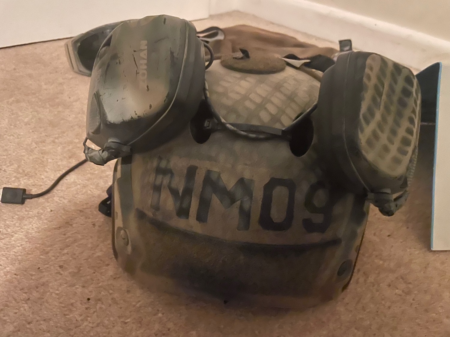 Fast style helmet, painted, new foam, go pro mount, active ear defenders, uk patches, cutout of inner lining for battery pack, I still have the cut out of the lining that I can find and I have the padding that was originally attached