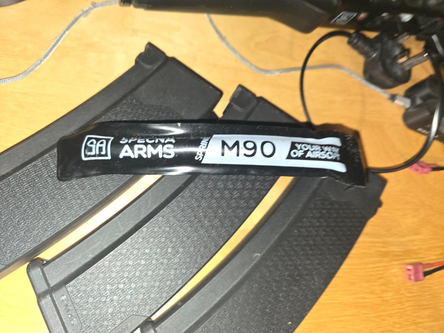 This package includes: 3 mags 2 mid caps and 1 high cap, 2 1450 mah batteries, a holographic sight, charging pack to charge standard rif batteries and ak batteries, and one to charge the holo battery, m90 spring (spare)