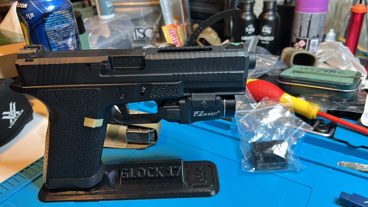 Emg sai blu glock superb piece of kit very well built hence the price they are new , this has a waldow short stroke kit only a few buffers to increase snappiness , maple leaf drop in kit with new flamingo bucking , cokes with x5 gas tight mags can include the torch for extra £££ and the stand looking for £225 collection can arrange postage for extra ££££. 07850528387