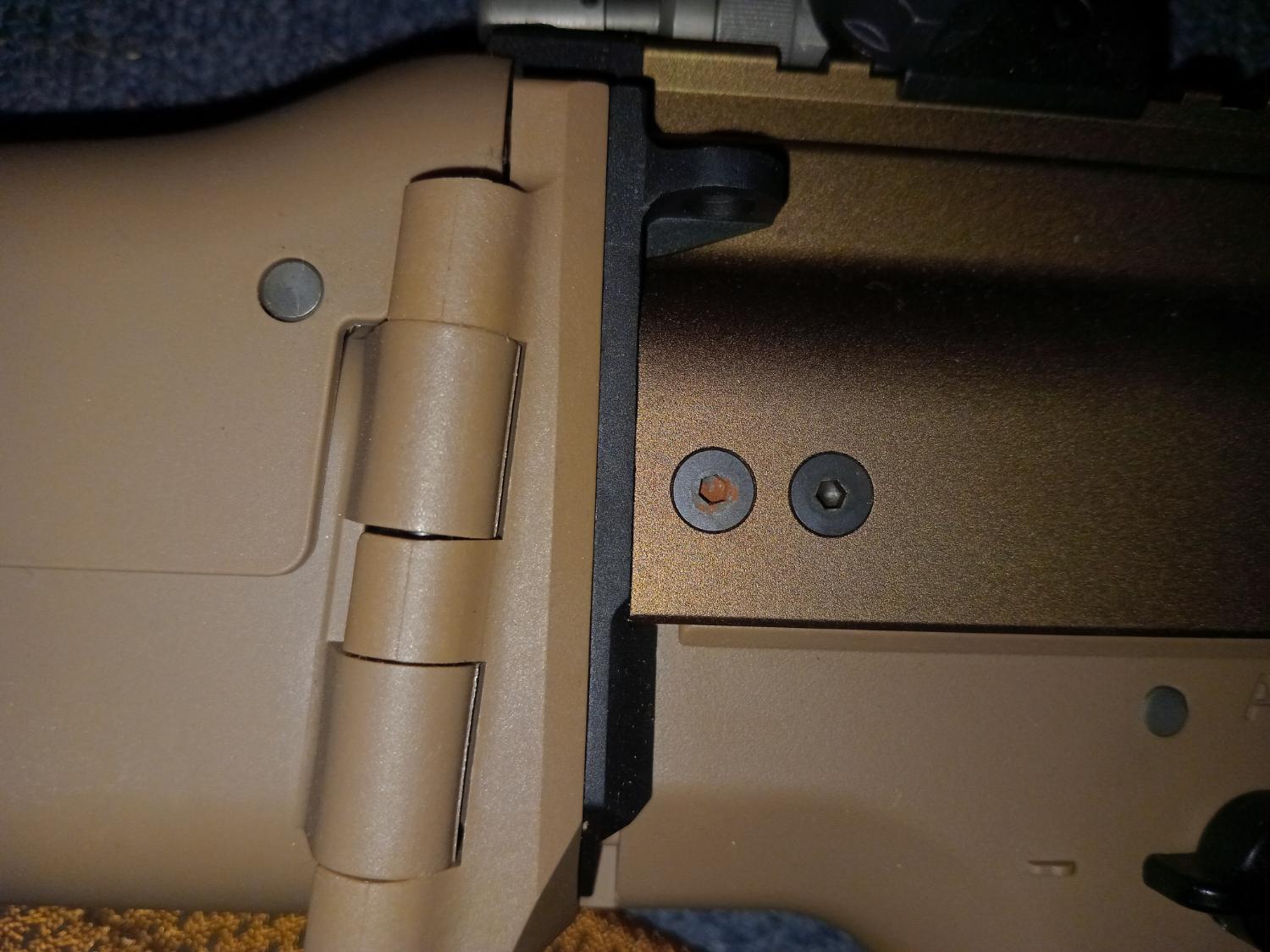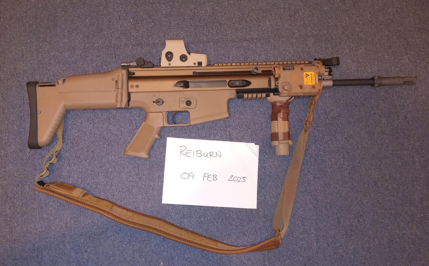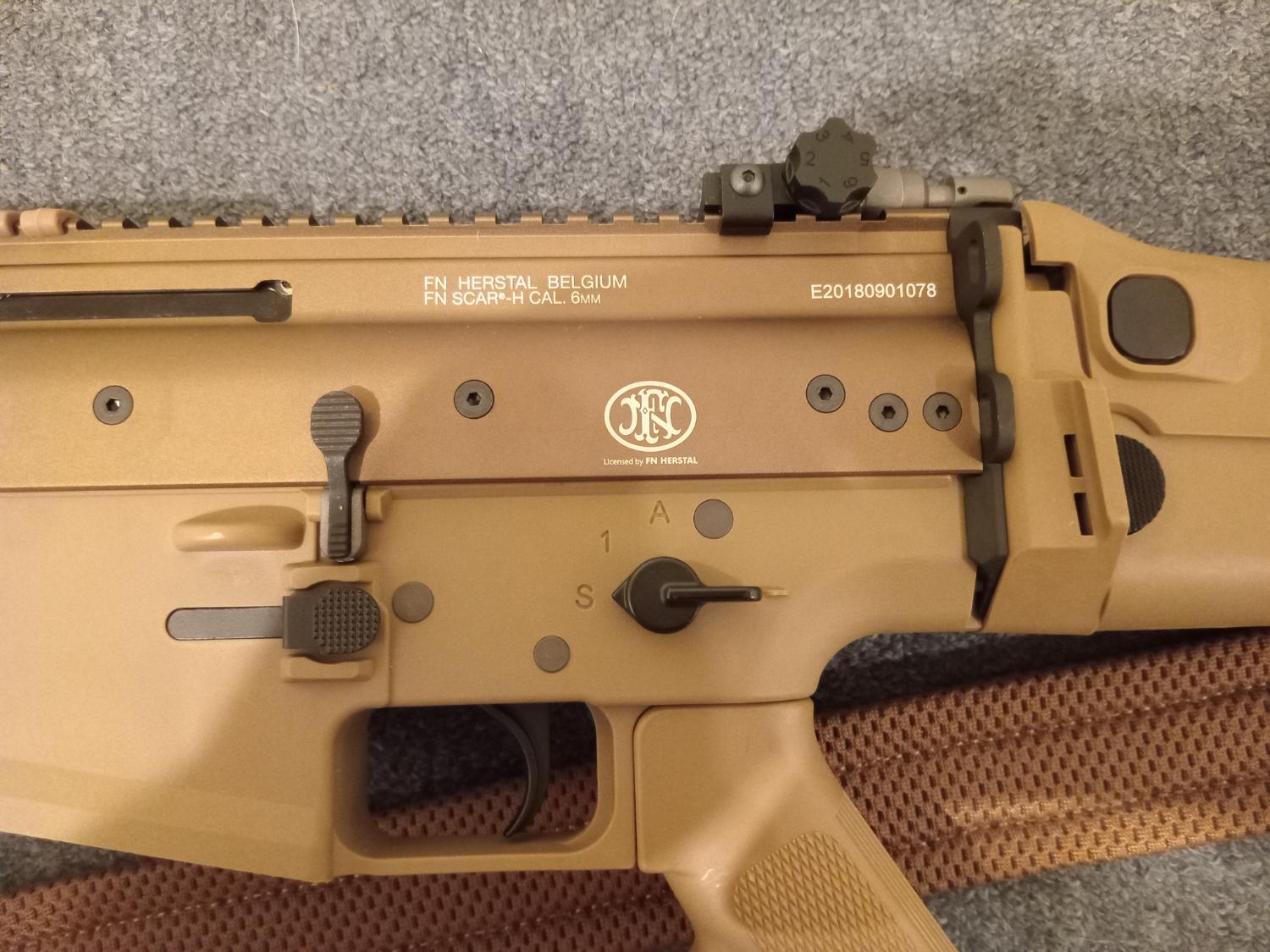 No upgrades to the SCAR itself. But it shoots around 360fps on green gas so it had been modified to make it single shot only to use as a DMR) The modification is internal and can be revoked by an engineer if desired, it is a simple reattachment near the trigger.