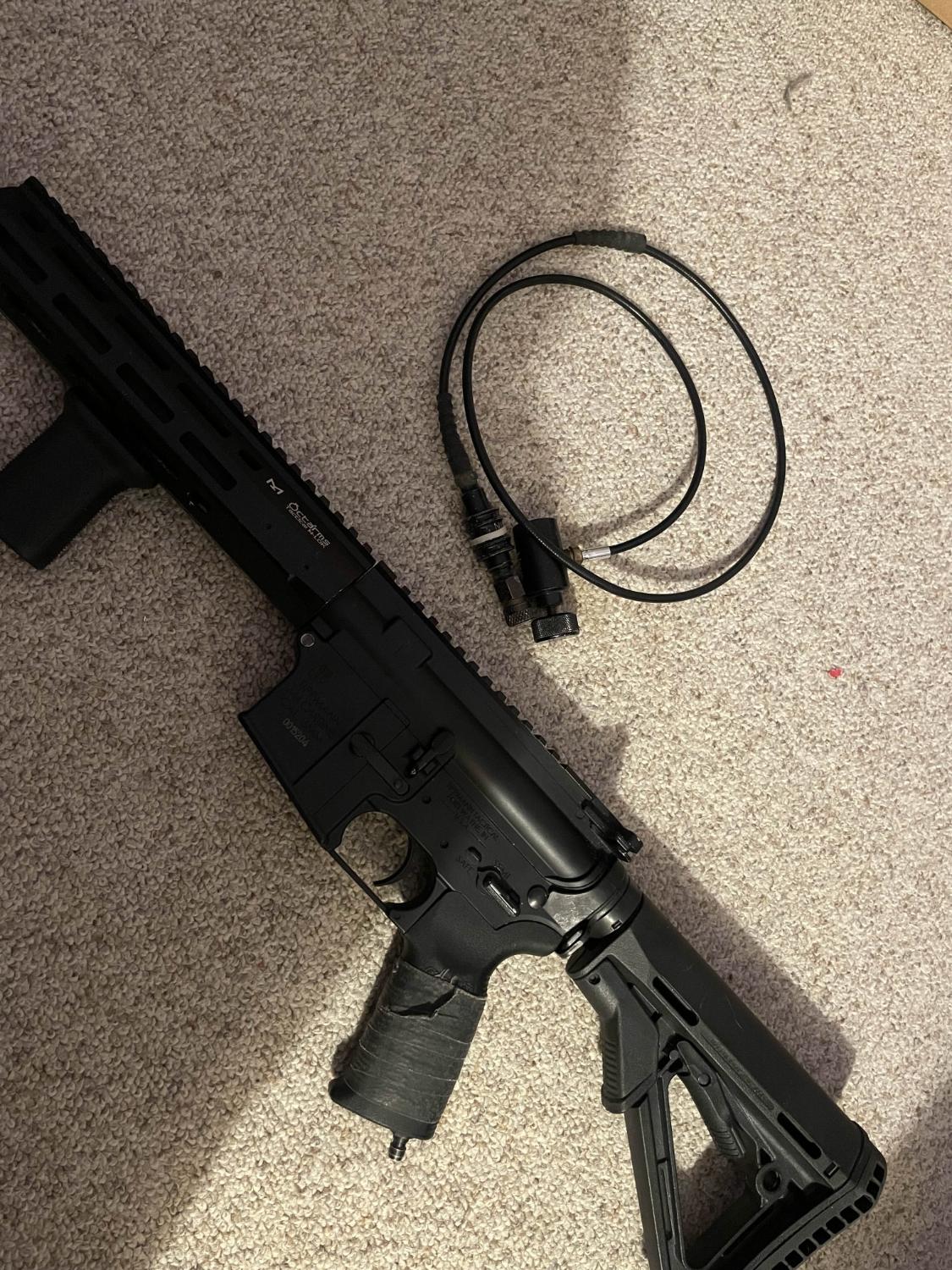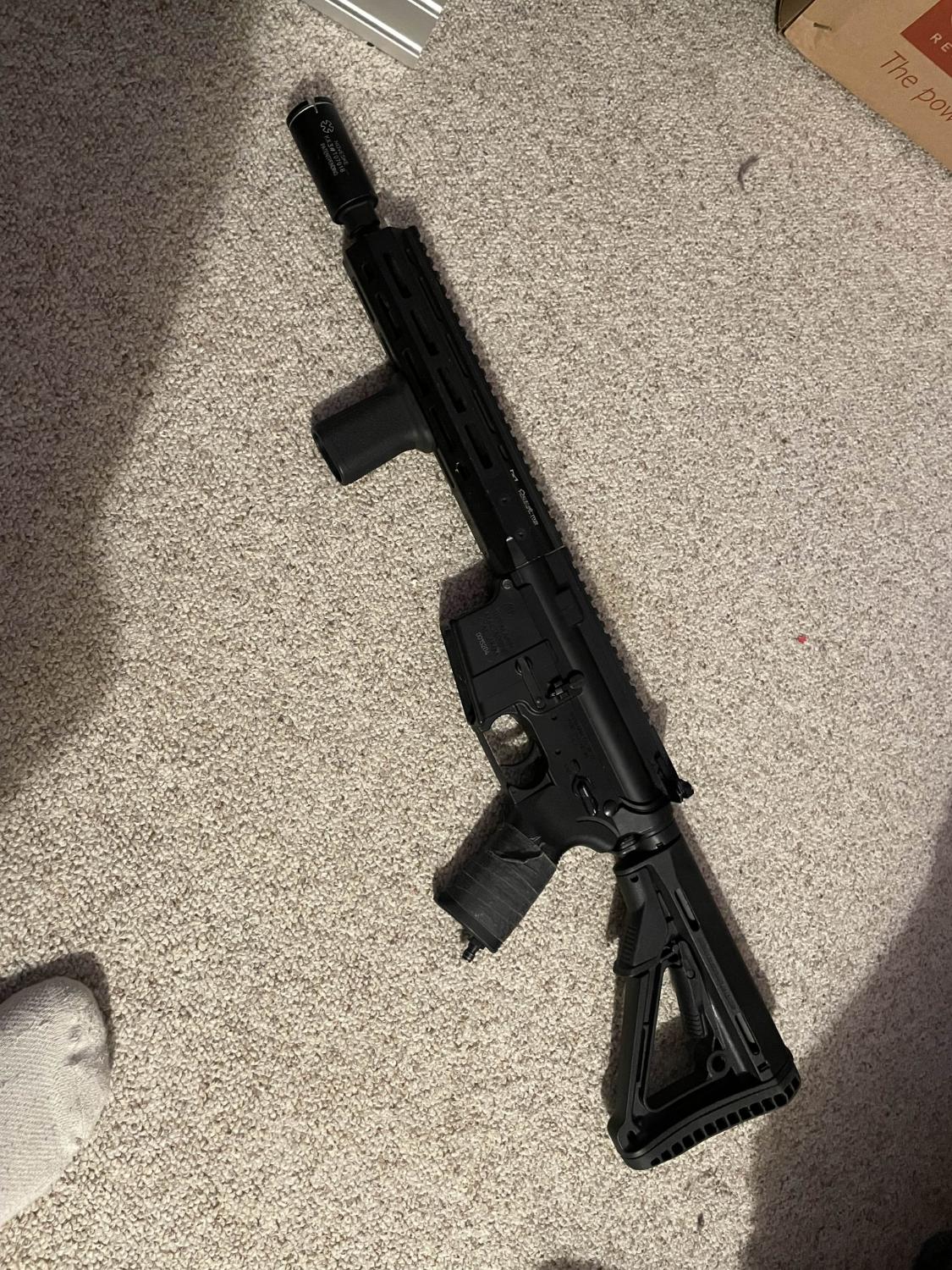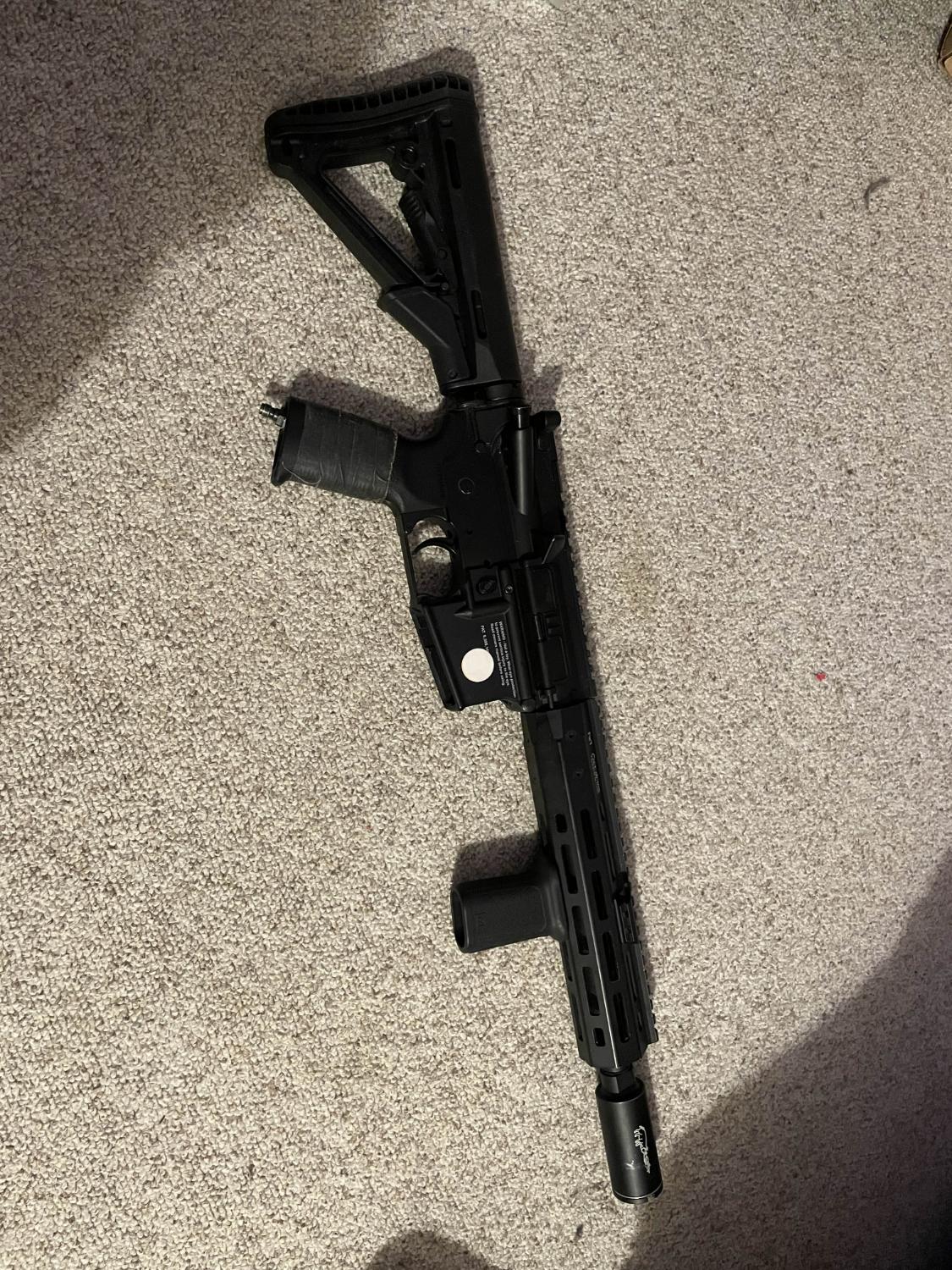 Has a TDC mod done to it, also has an Octarms M-Lok rail, Moe stock, foregrip and a noveske style barker up front.