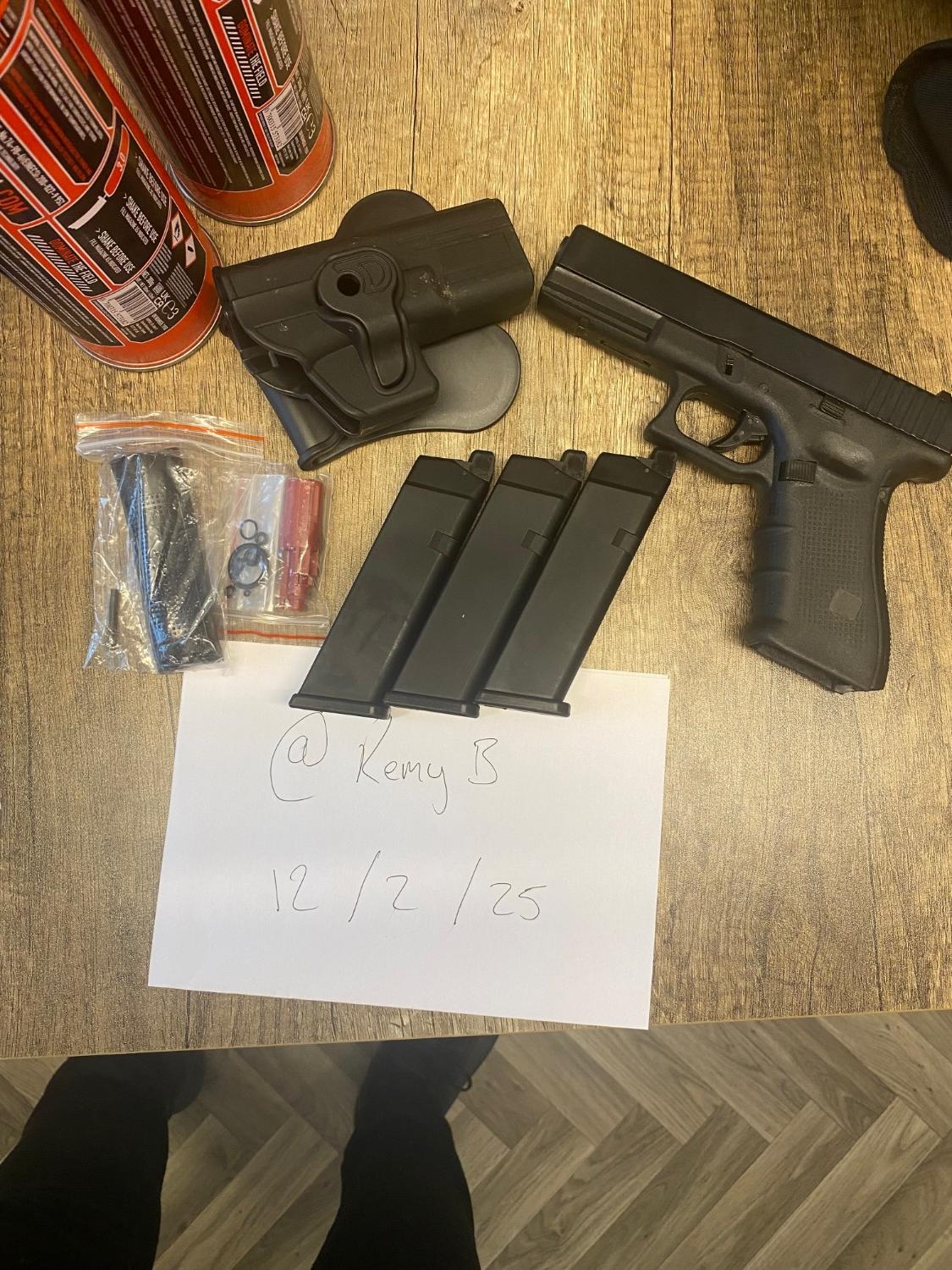 Raven glock, holster, 3x mags, spares and grips, 2x red gas
