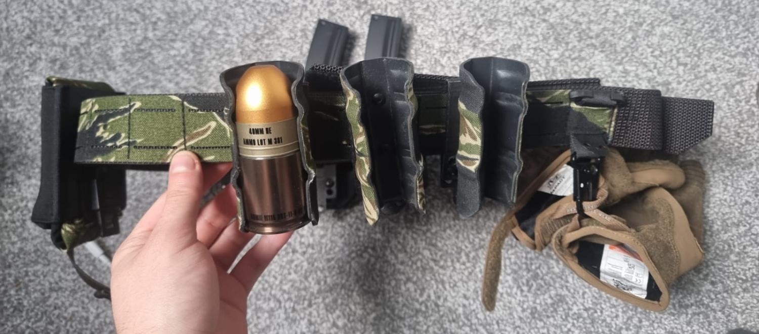 3 x 40mm grenade / moscart holsters, tiger stripe cordura wrapped