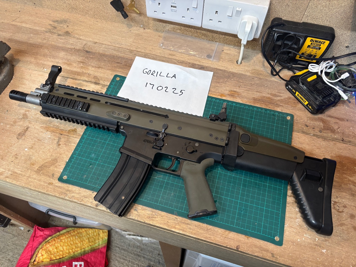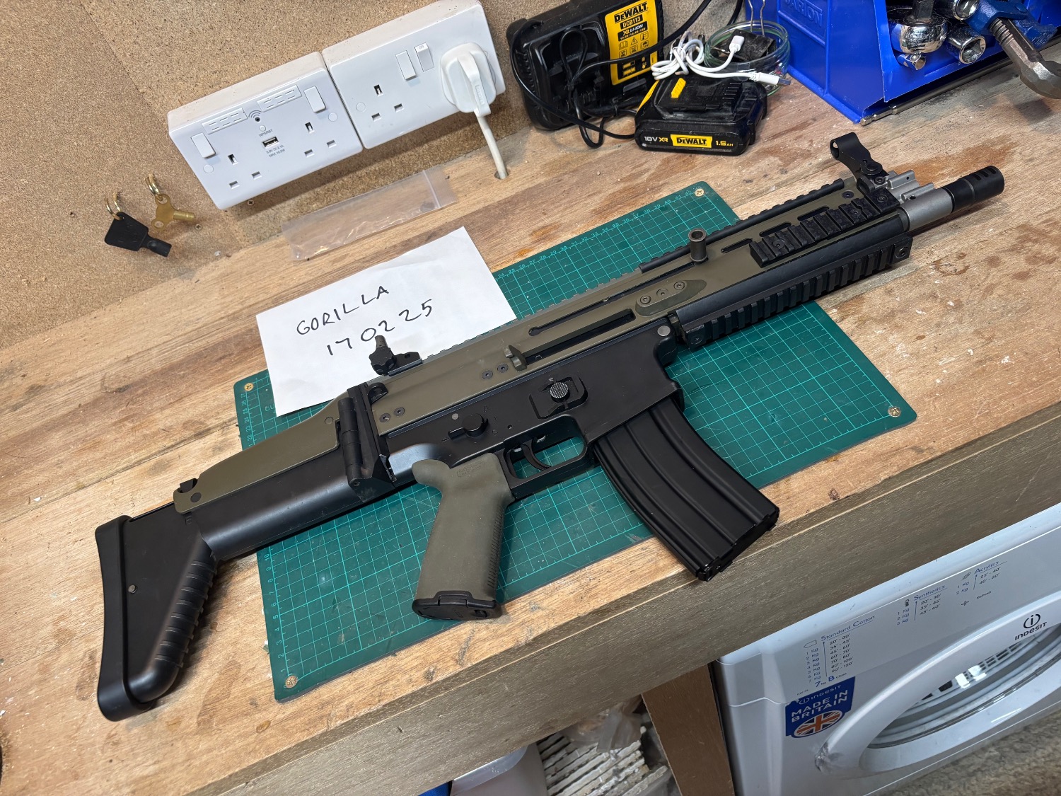 WE SCAR L, has a RS Magpul pistol grip, also has had a brand new trigger box fitted. NPAS as standard. Shoots nicely. Comes with 1 leak free mag. Only issue is that it fires single on auto and auto on single, I’m led to believe that this is a simple fix by fitting the trigger cam in correctly- I just don’t have the time. Price includes P & P