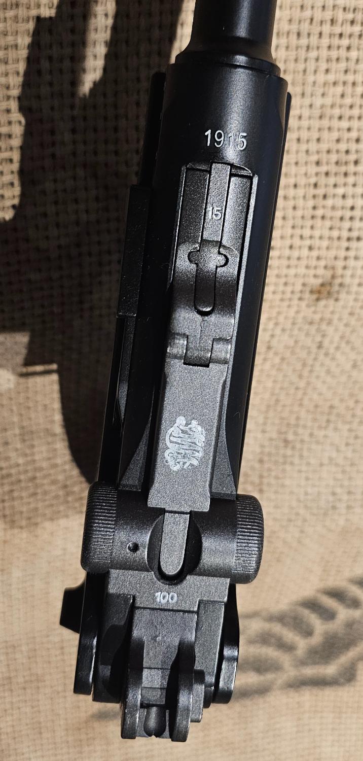 This P08 has identical markings as a real navy P08 has. with factory code, serial number, factory stamps and suffix code. This P08 has the markings of a numbers matching navy P08 made by DWM in 1915.