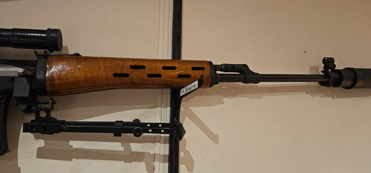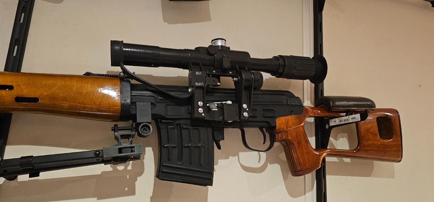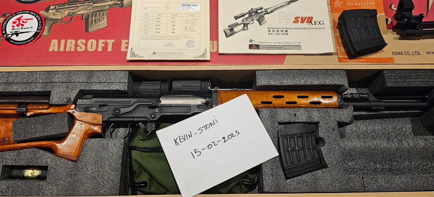 The SVD is in mint condition. a real collector's piece that has not been skirmished with. The SVD comes in the original box together with all booklets, certificate and other accessories. There is also a Real Sword PSO scope with the original storage bag. Furthermore, a 2nd mid-cap magazine, a replica S-101 bipod and an RGW TGP-V silencer are included.