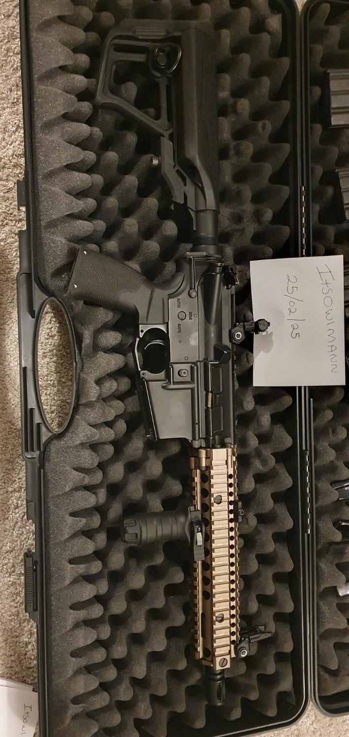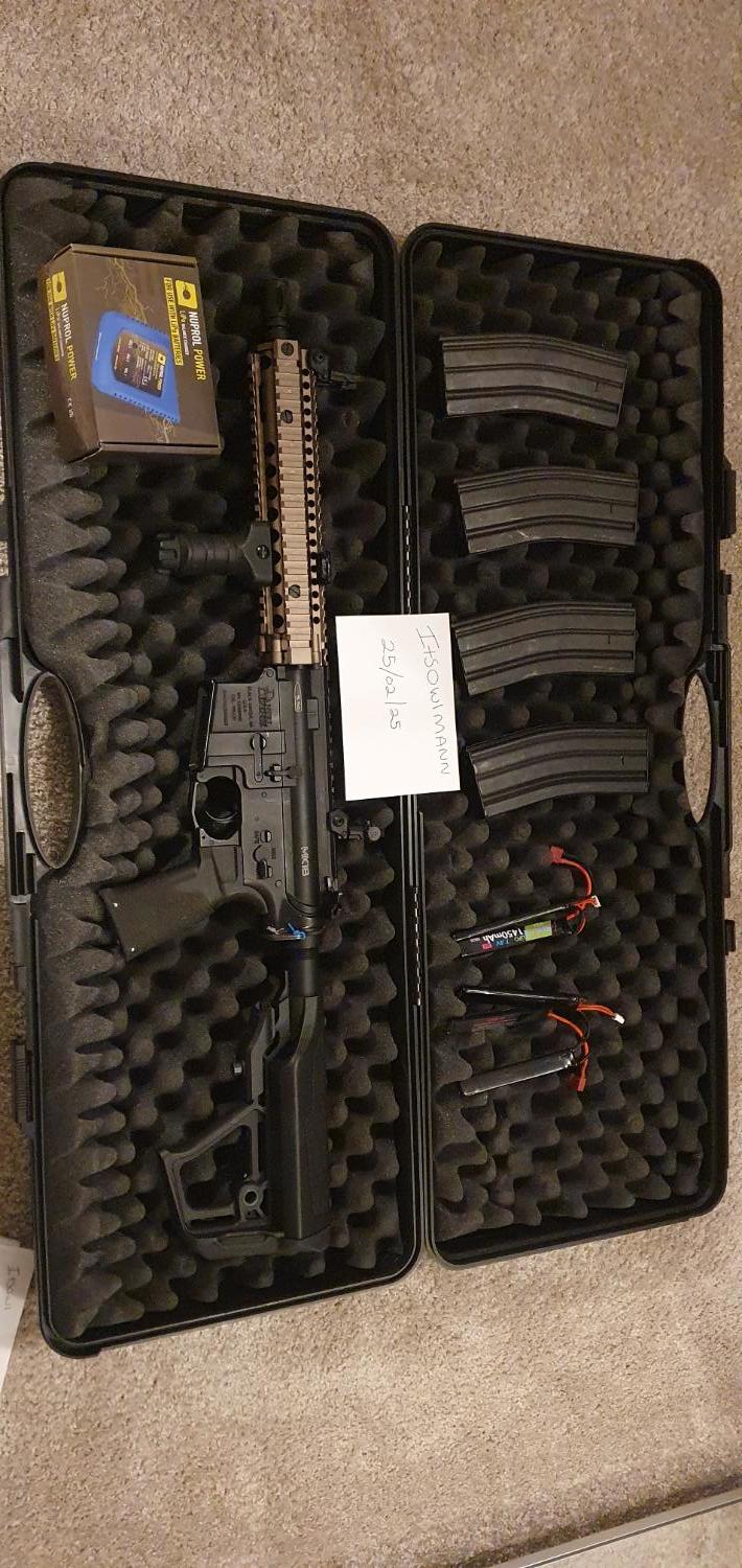 3 high cap mags, 1 mid cap mag, 1 hard carry case, 1 foregrip, 2 batteries, 1 nuprol charger.